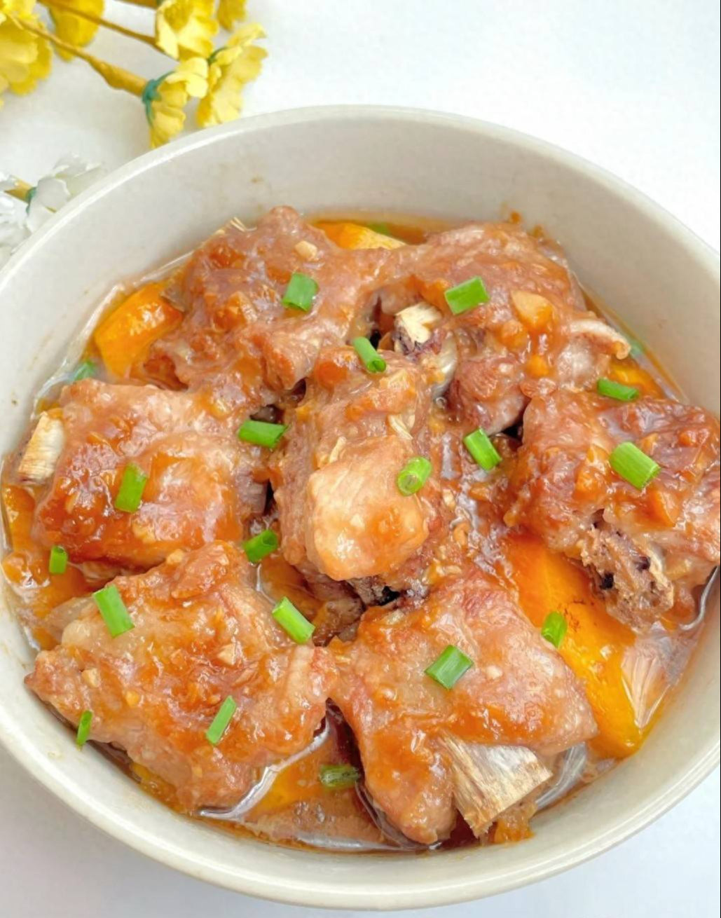 Nguyên liệu cần thiết: 500g sườn heo, 2 củ khoai lang, gừng băm, tỏi băm, hành lá thái nhỏ (tùy chọn), 1.5 thìa canh bột năng, 1 thìa canh dầu hào, lượng gia vị thích hợp.