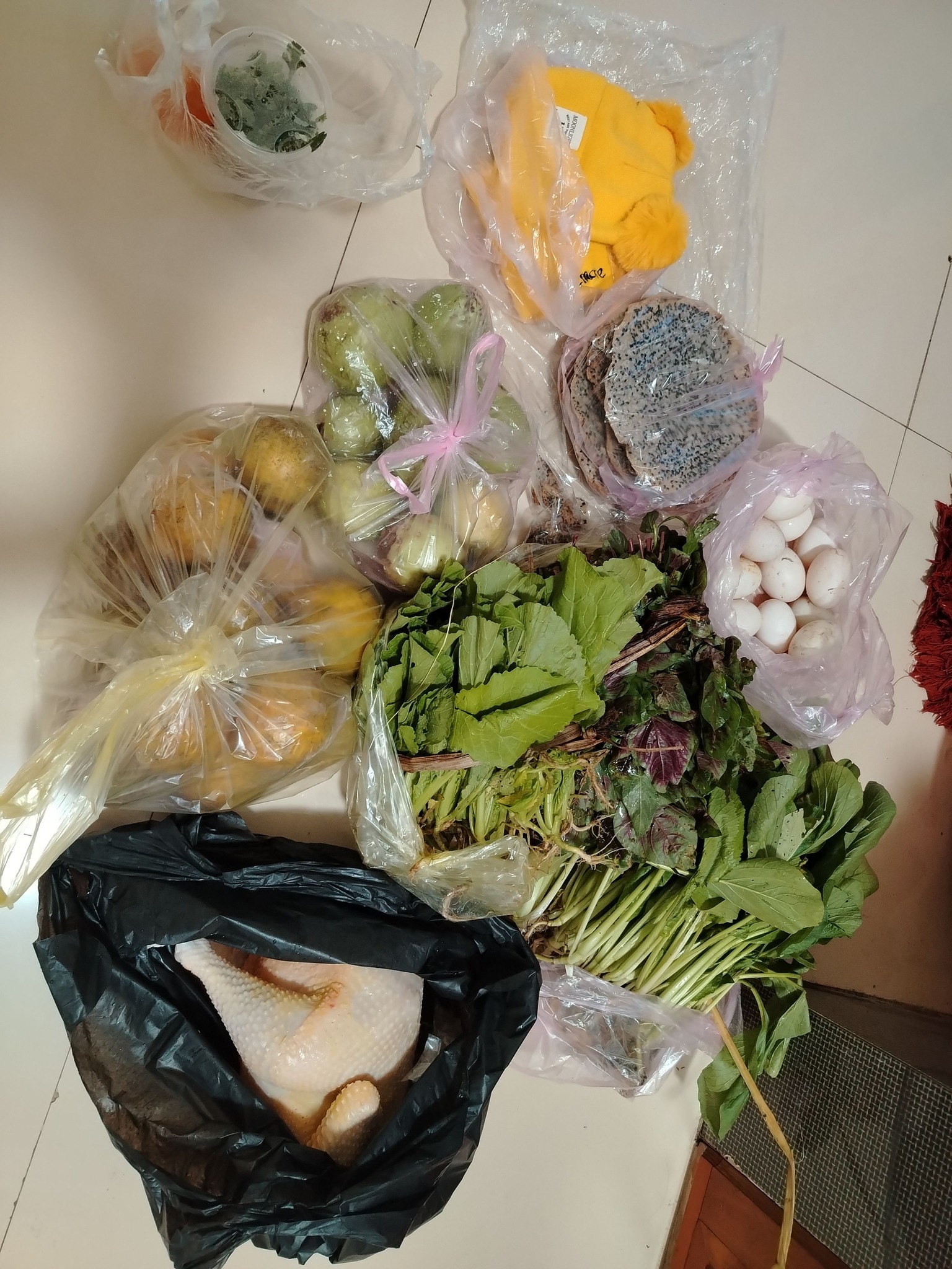 “Nay em đi chợ, chỗ này em mua hết 400k. Được 1 con gà 2,3 kg, 20 quả trứng vịt, 3 bó rau, 2kg ổi, 3kg cam, 10 cái bánh đa, 1 mũ len cho con, 1 cốc bánh bèo, 1 bịch hạt nổ. Nhà em có 6 người, trung bình mỗi ngày ăn hết khoảng 200k” - Cô viết.