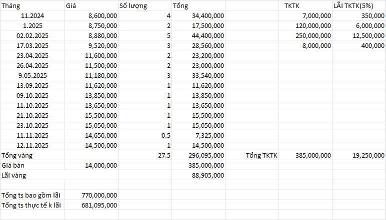 Có thể thấy, cô gái này mua vàng tích sản khá đều đặn, song song với đó còn gửi tiết kiệm ngân hàng. Tổng tài sản mà cô có là 27,5 chỉ vàng và 385 triệu đồng tiết kiệm.