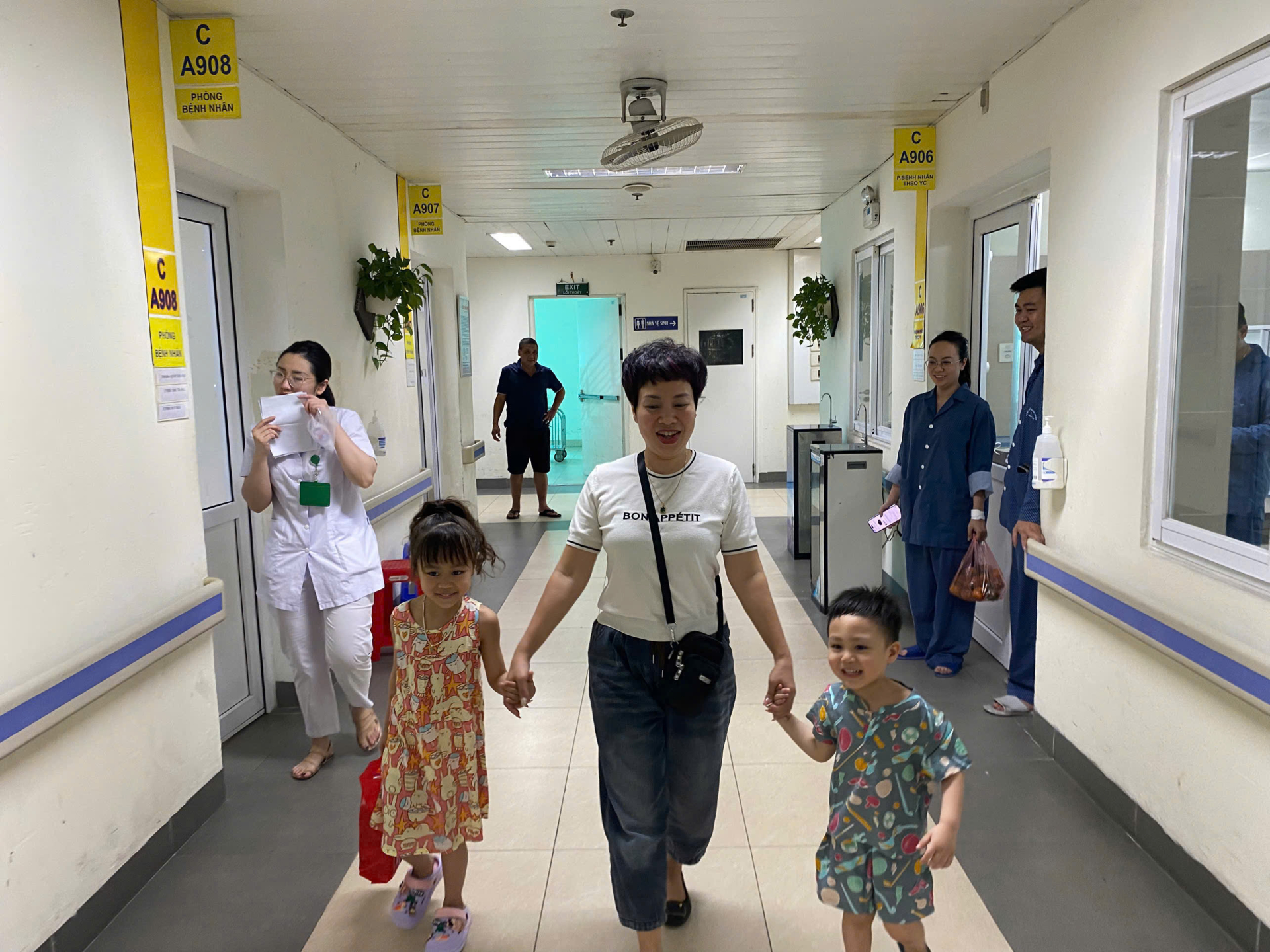 Gia đình nạn nhân vụ hỏa hoạn xuất viện chiều 26/3. (Ảnh: BVCC)