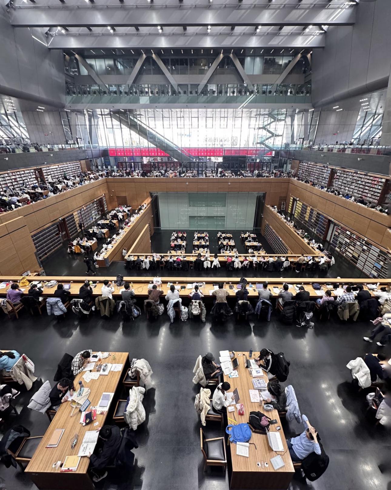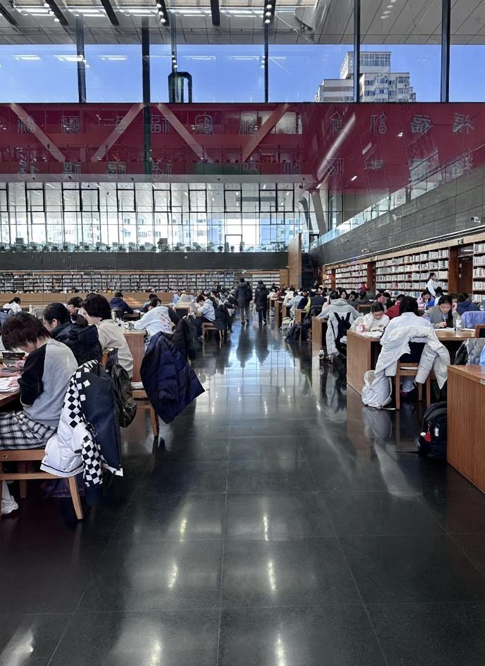 Theo chia sẻ từ một bài đăng trên mạng xã hội, sáng mùng 3 Tết tại Thư viện Quốc gia (Trung Quốc), 9 giờ mở cửa nhưng người này chỉ cần đến sớm 10 phút thôi đã thấy đoàn người xếp hàng dài bên ngoài. Khi vào bên trong, gần như mọi bàn học đều kín chỗ, chỉ còn lại vài vị trí trống ở góc.