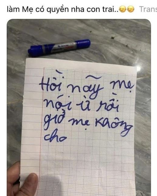 Lướt mạng xã hội, tôi tình cờ bắt gặp một bức ảnh khiến ai nhìn vào cũng phải bật cười. Đó là tờ giấy kẻ ô li với những dòng chữ viết vội, đầy vẻ hằn học và ấm ức của một cậu bé gửi cho mẹ mình: "Hồi nãy mẹ nói ừ rồi, giờ mẹ không cho". Kèm theo bức ảnh "tố cáo" ấy là dòng trạng thái tếu táo của người mẹ: "Làm Mẹ có quyền nha con trai" .
