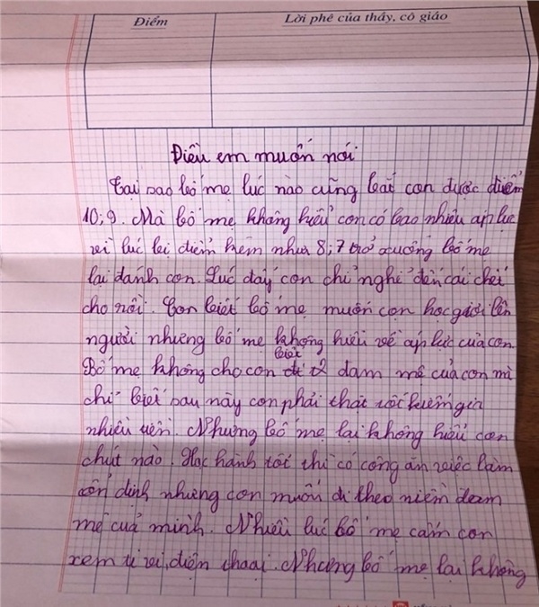 Tại sao bố mẹ lúc nào cũng bắt con được điểm 10; 9. Mà bố mẹ không hiểu con có bao nhiêu áp lực vì lúc bị điểm kém như 8; 7 trở xuống bố mẹ lại đánh con. Lúc đấy con chỉ nghĩ đến cái chết cho rồi. Con biết bố mẹ muốn con học giỏi nên người nhưng bố mẹ không hiểu về áp lực của con.