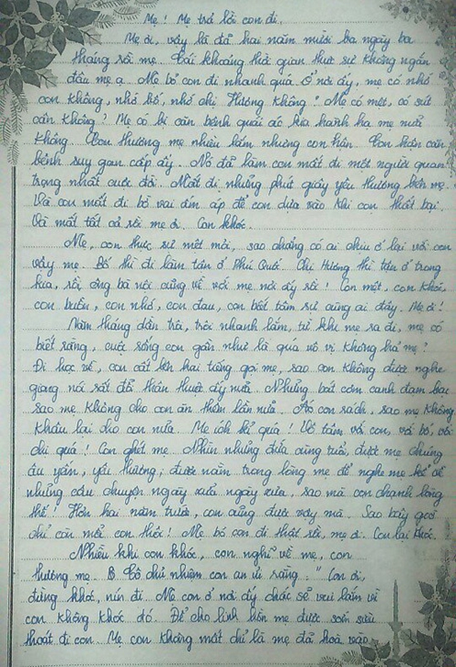 Mẹ ạ, nếu mẹ đọc được bức thư này mẹ hãy về trong giấc mơ của con nhé mẹ. Con yêu mẹ nhiều lắm. Con nhớ mẹ nhiều lắm. Mẹ ơi, con chỉ mong rằng linh hồn mẹ sớm được siêu thoát nên từ bây giờ con sẽ cố gắng không khóc, sẽ làm cho mẹ vui, làm cho mẹ nhanh khỏi bệnh. Nơi ấy, mẹ hãy giữ gìn sức khỏe, mẹ của con nhé! Và một điều cuối cùng con nói rằng: “Kiếp sau, dù sao đi nữa, mẹ sẽ mãi là mẹ của con. Con thương mẹ nhiều". Con cám ơn mẹ.