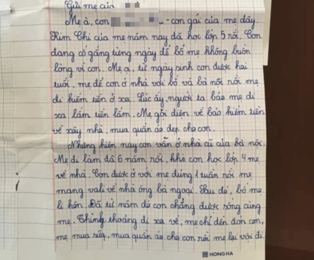 Thế nhưng, theo lời đứa trẻ, nhiều năm trôi qua, căn nhà mới vẫn chưa xuất hiện, quần áo đẹp cũng chỉ là lời hứa qua điện thoại. Điều em nhớ rõ nhất không phải là tiền, mà là sự vắng mặt kéo dài của mẹ. “Mẹ đi làm đã 6 năm rồi. Khi con học lớp 4, mẹ về nhà. Con được ở với mẹ đúng 1 tuần rồi mẹ mang vali về nhà ông bà ngoại”, bức thư viết tiếp.