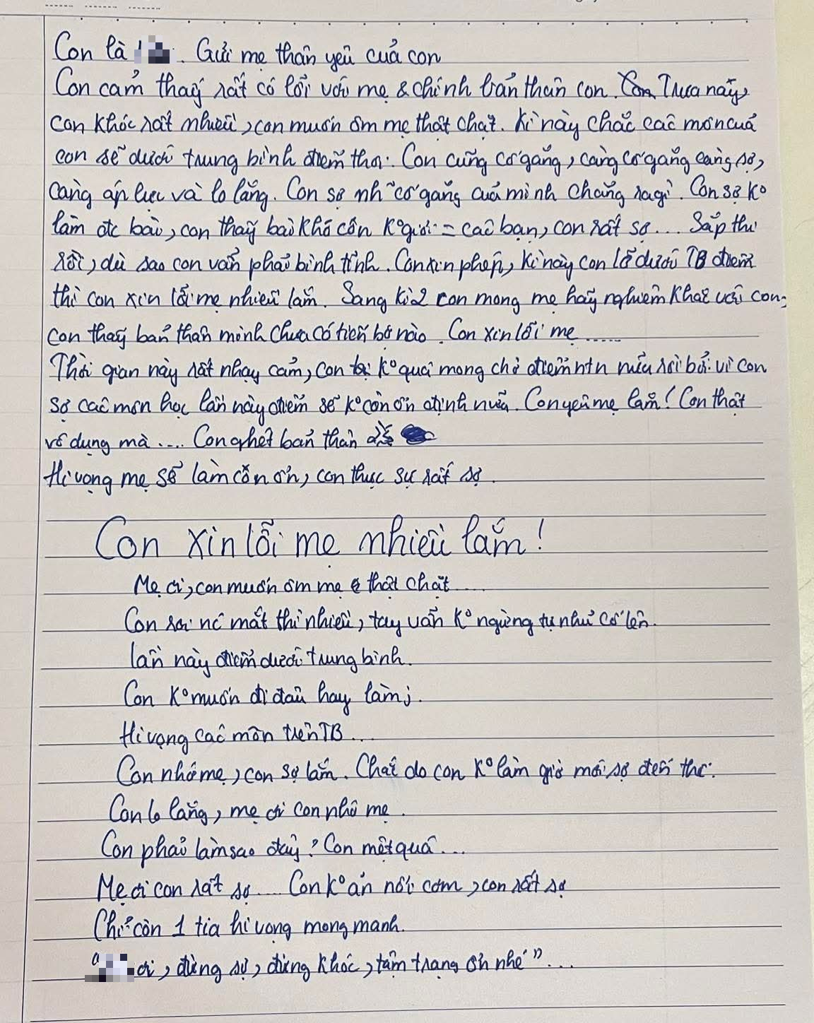 Em không trách mẹ, không oán than. Ngược lại, em liên tục xin lỗi. Xin lỗi vì điểm số có thể không cao, xin lỗi vì mình chưa làm tốt, xin lỗi vì khiến mẹ lo lắng. Trong từng dòng chữ là nỗi bất an của một đứa trẻ luôn tự hỏi: "Mình đã làm đủ chưa?".