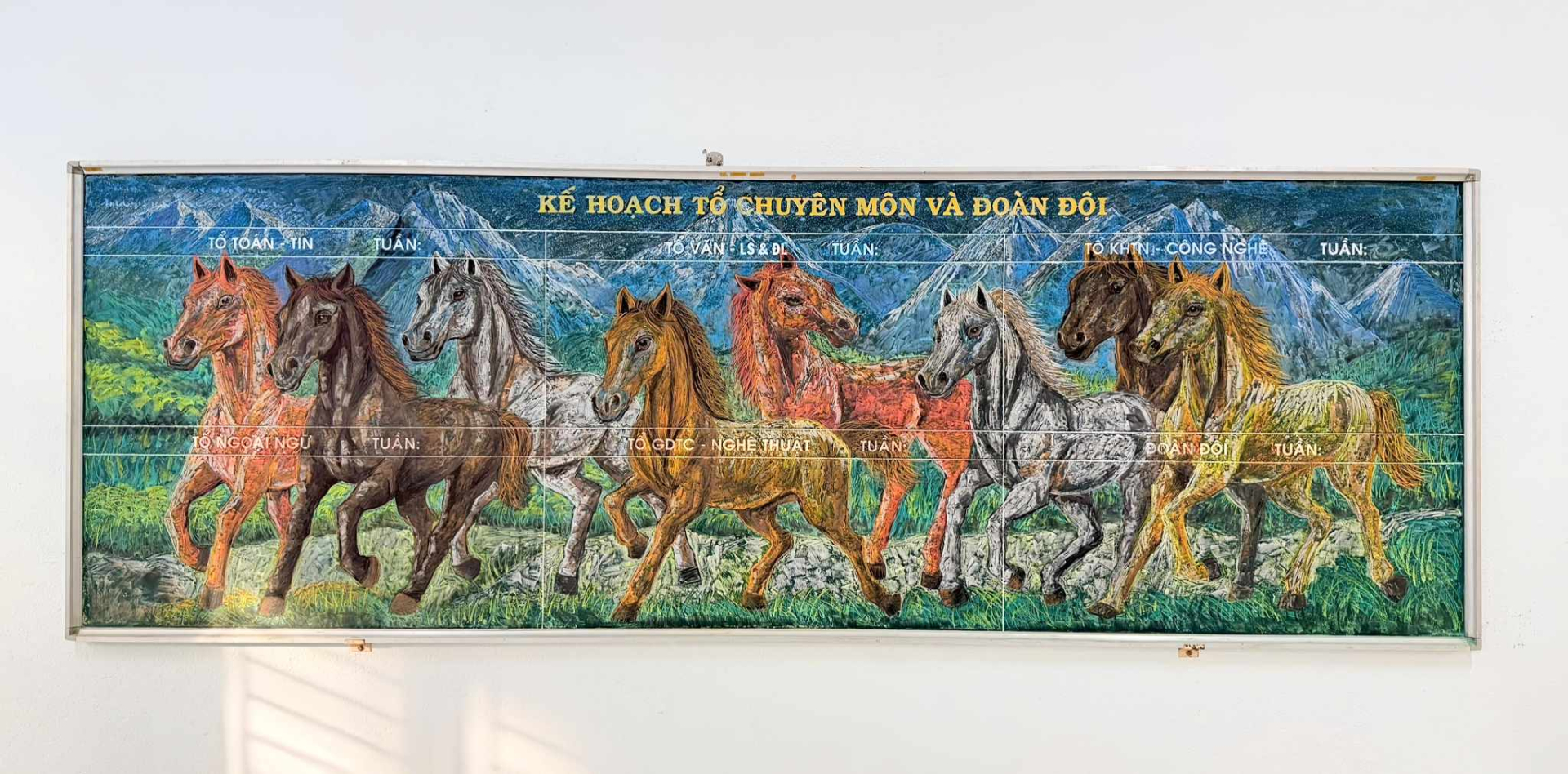Bức tranh được hoàn thiện trong 4 ngày, tranh thủ vào các ngày thứ Bảy, Chủ nhật và những lúc trống tiết dạy. Thử thách lớn nhất không chỉ là số lượng con vật, mà còn là việc làm sao để mỗi chú ngựa có thần thái riêng, chuyển động chân linh hoạt, bố cục hài hòa trên một không gian bảng phấn có giới hạn.