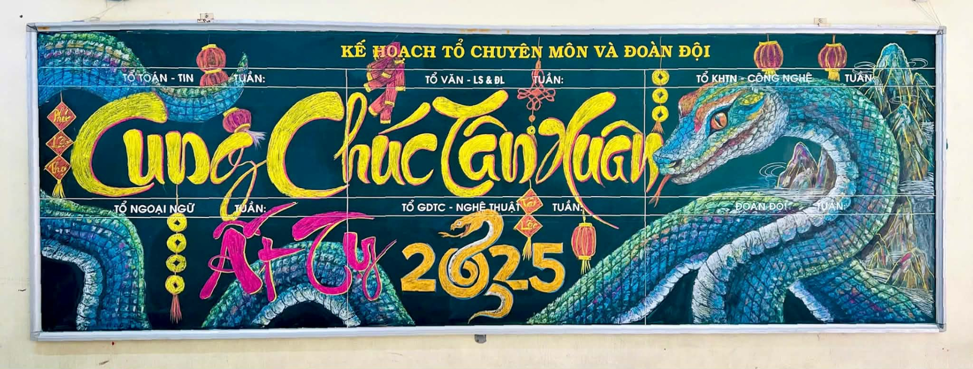 Từ năm 2023 đến nay, mỗi dịp xuân về, bảng phấn lớp học lại khoác lên mình một linh vật. (Ảnh: NVCC)