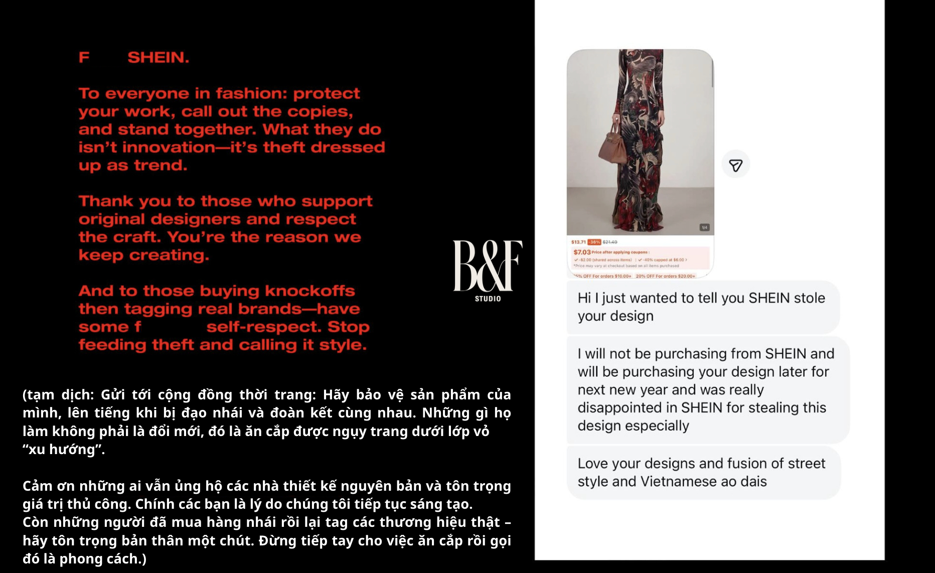 Câu chuyện của Duc Studio vì vậy không chỉ đơn thuần là một vụ đạo nhái, mà là minh chứng cho khoảng cách không thể thu hẹp giữa một trong những nhà sản xuất độc lập và một đế chế được tạo ra để sao chép mọi thứ nhanh hơn, rẻ hơn. Và hơn hết, chừng nào một chiếc áo 7 đô la vẫn đang thắng mọi lý lẽ đạo đức trong mắt hàng triệu người tiêu dùng, thì câu hỏi không còn là SHEIN có dừng lại không, mà là sẽ còn bao nhiêu tâm huyết sáng tạo nữa bị cuốn phăng đi trước khi có ai đó tìm ra cách ngăn chặn cỗ máy này lại.