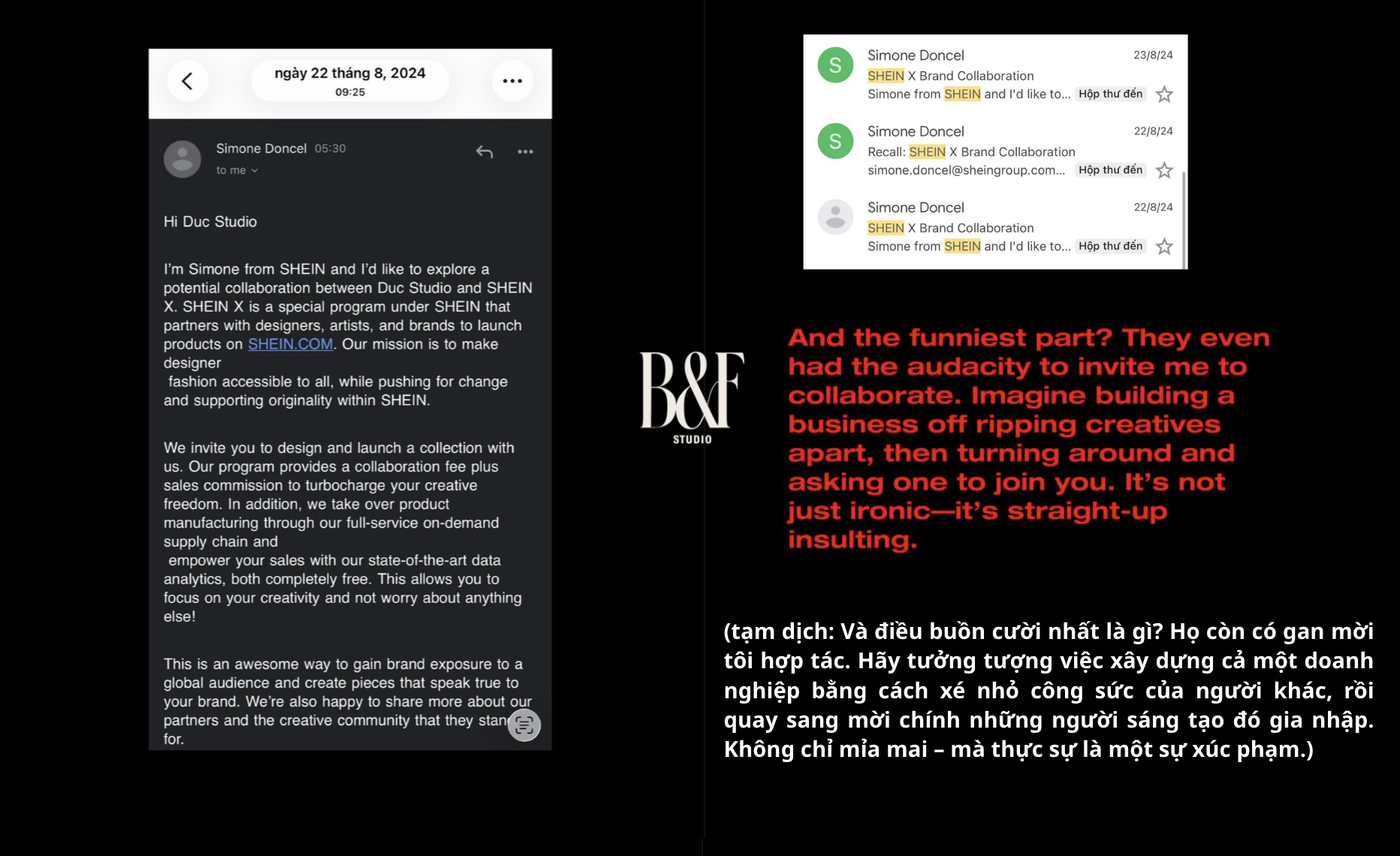 Điều khiến NTK Nguyễn Minh Đức cảm thấy bị xúc phạm nhất chính là thái độ của SHEIN. Ngay từ năm 2024, khi Duc Studio bắt đầu phát hiện các dấu hiệu đạo nhái đầu tiên, phía SHEIN thay vì đưa ra lời giải thích thì lại chủ động liên hệ gửi thư mời hợp tác (collab). Trong email, SHEIN ngỏ lời muốn thương hiệu Việt thiết kế và ra mắt bộ sưu tập với lời hứa hẹn về sự "tự do sáng tạo" và khả năng tiếp cận khán giả toàn cầu. Trong bài đăng thể hiện sự bức xúc, phía Duc Studio cho rằng việc xây dựng một doanh nghiệp dựa trên việc xé nhỏ công sức của người khác, rồi quay sang mời chính những người sáng tạo đó gia nhập không chỉ là sự mỉa mai, mà thực sự là một sự xúc phạm nặng nề đối với bất kỳ ai coi trọng giá trị thủ công.