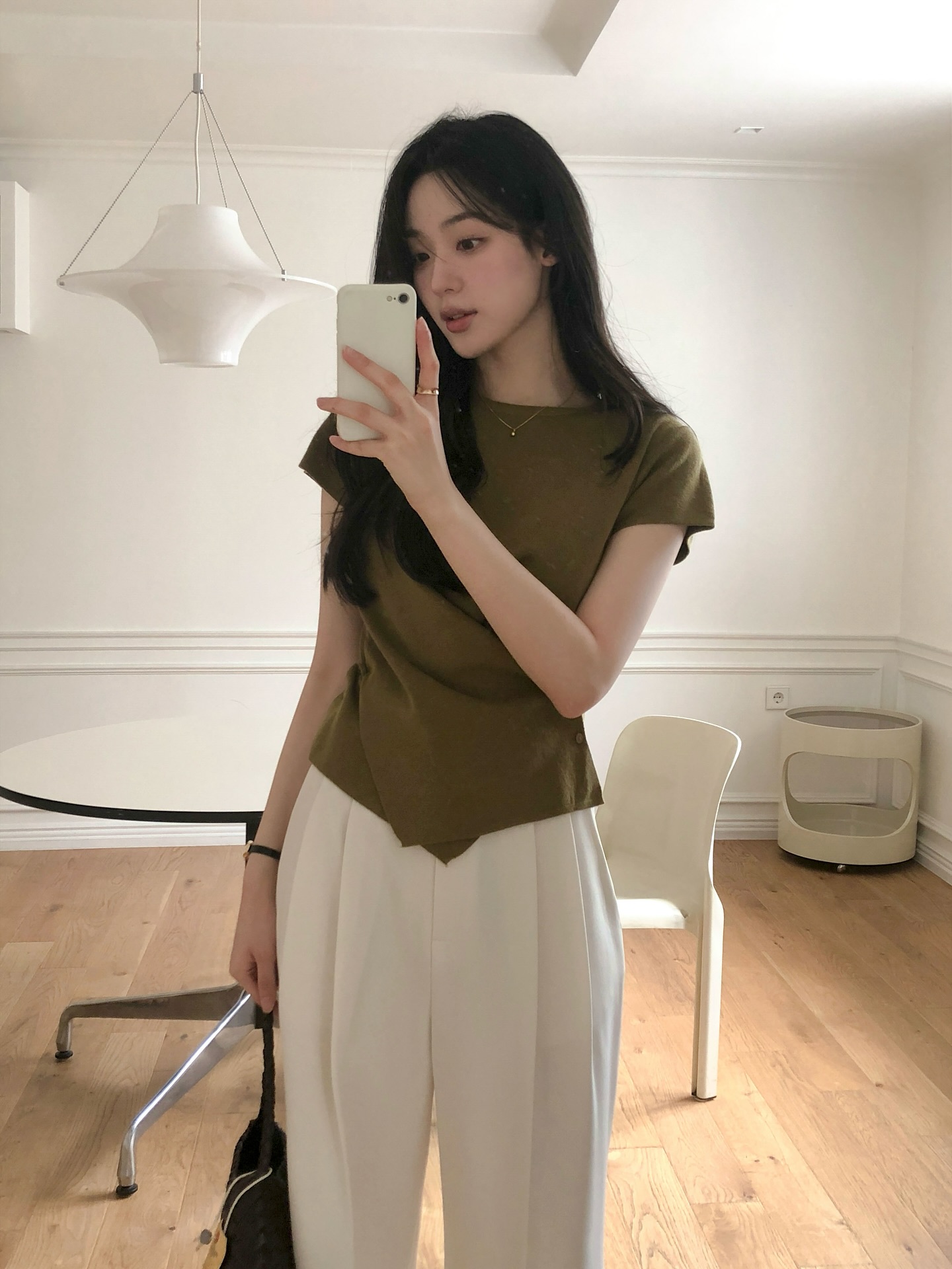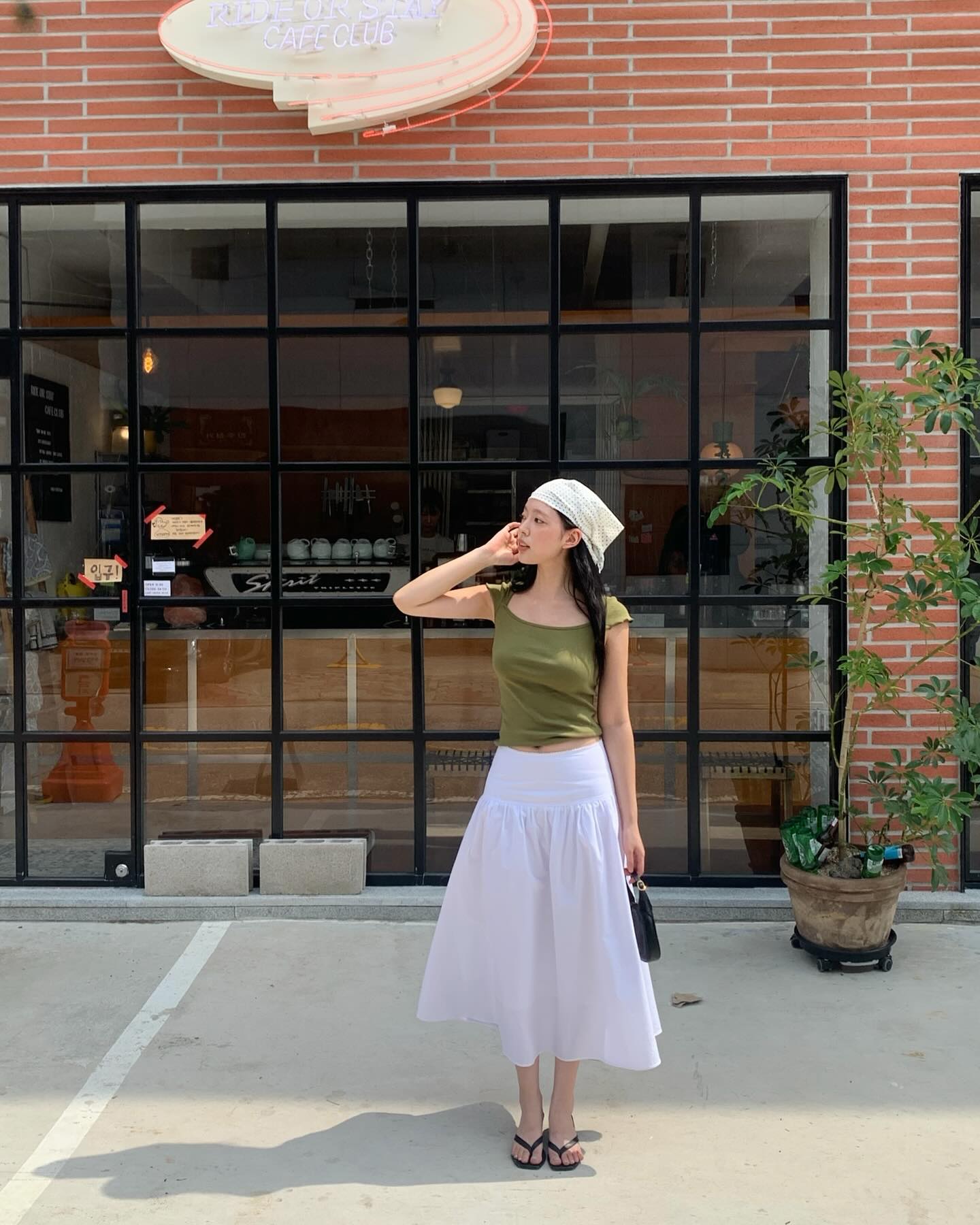 Cách phối rất dễ: áo thun + quần trắng cho vibe gọn gàng; áo thun + chân váy trắng cho vẻ nữ tính; hoặc khoác thêm sơ mi sáng màu bên ngoài để tăng chiều sâu. Chỉ cần sơ vin nhẹ phía trước hoặc xắn tay áo một chút là tổng thể đã khác hẳn, tự nhiên mà không hề cố gắng.