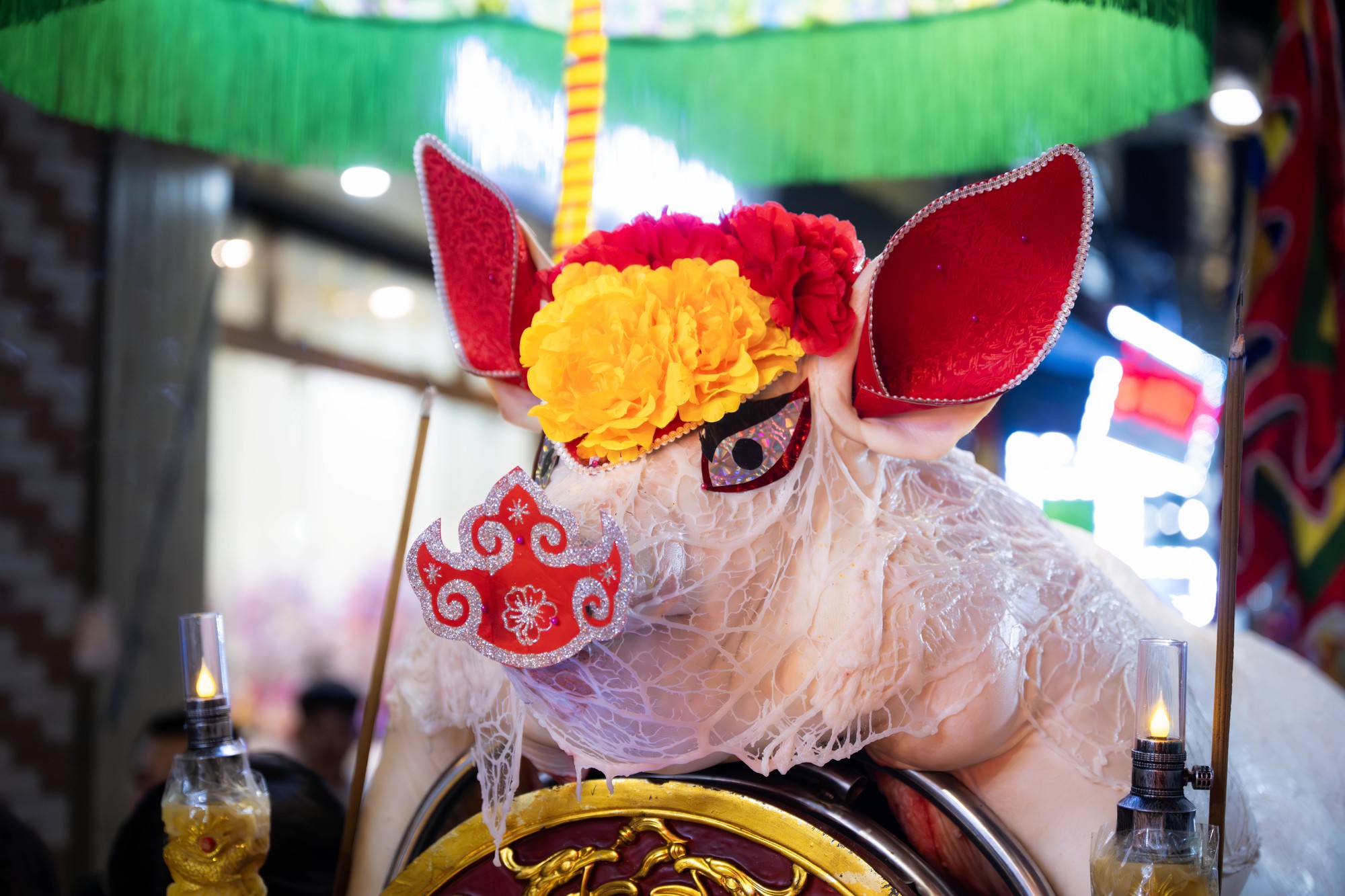Sau khi làm sạch, các “ông lợn” được trang trí công phu. Điểm đặc trưng nhất là công đoạn phủ mỡ chài lên thân. Lớp mỡ được bóc tách khéo léo, giữ nguyên vẹn rồi phủ đều như một tấm áo choàng óng ánh, tạo nên hình ảnh độc đáo của lễ hội làng La Phù.