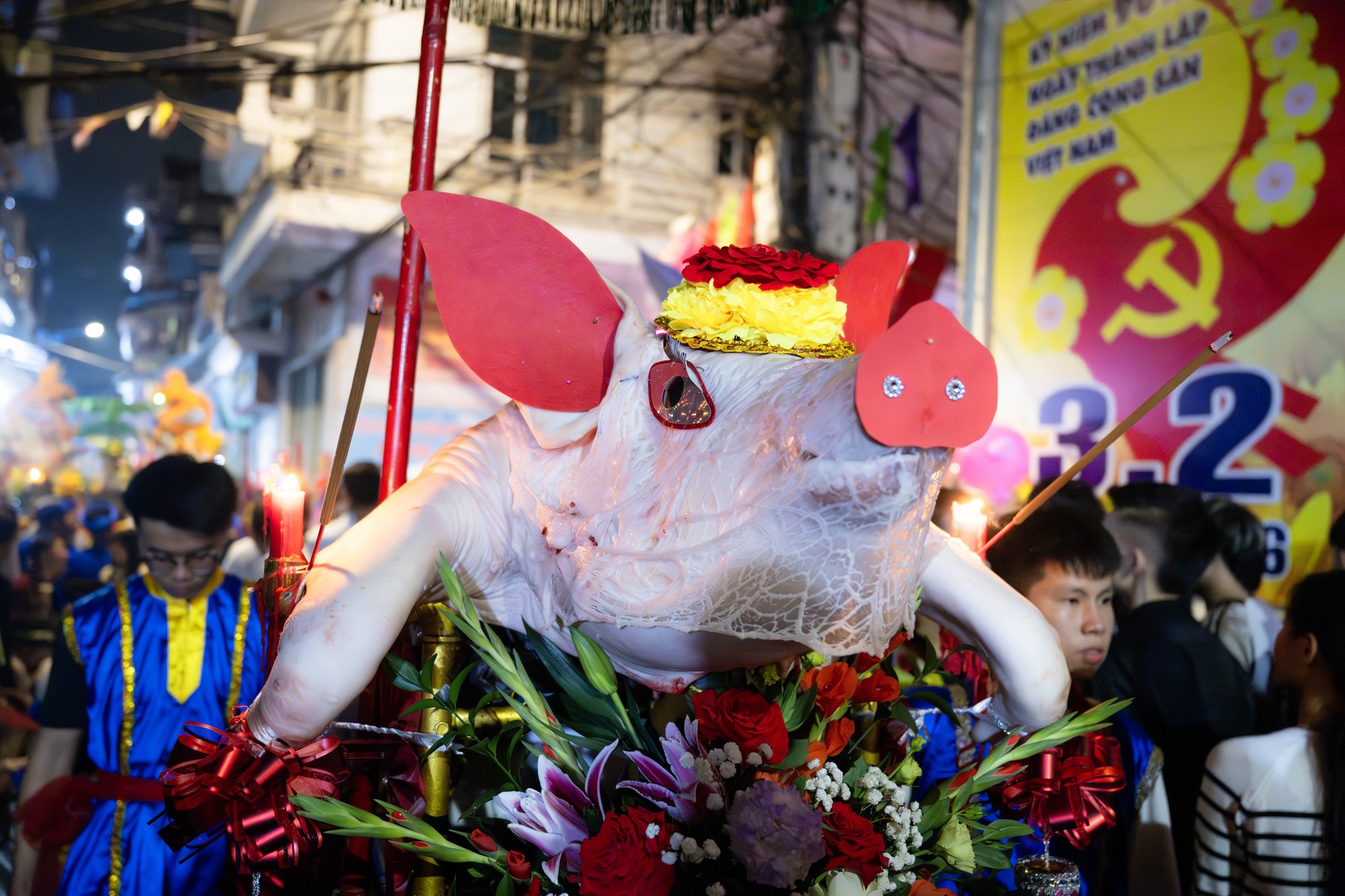 Đúng 18h, các đoàn rước bắt đầu xuất phát về đình làng trong tiếng trống chiêng rộn rã. Mỗi đoàn gồm kiệu “ông lợn”, kiệu mâm xôi và bàn lộc, đi đầu là đội nhạc lễ, tạo nên không khí tưng bừng khắp các ngả đường