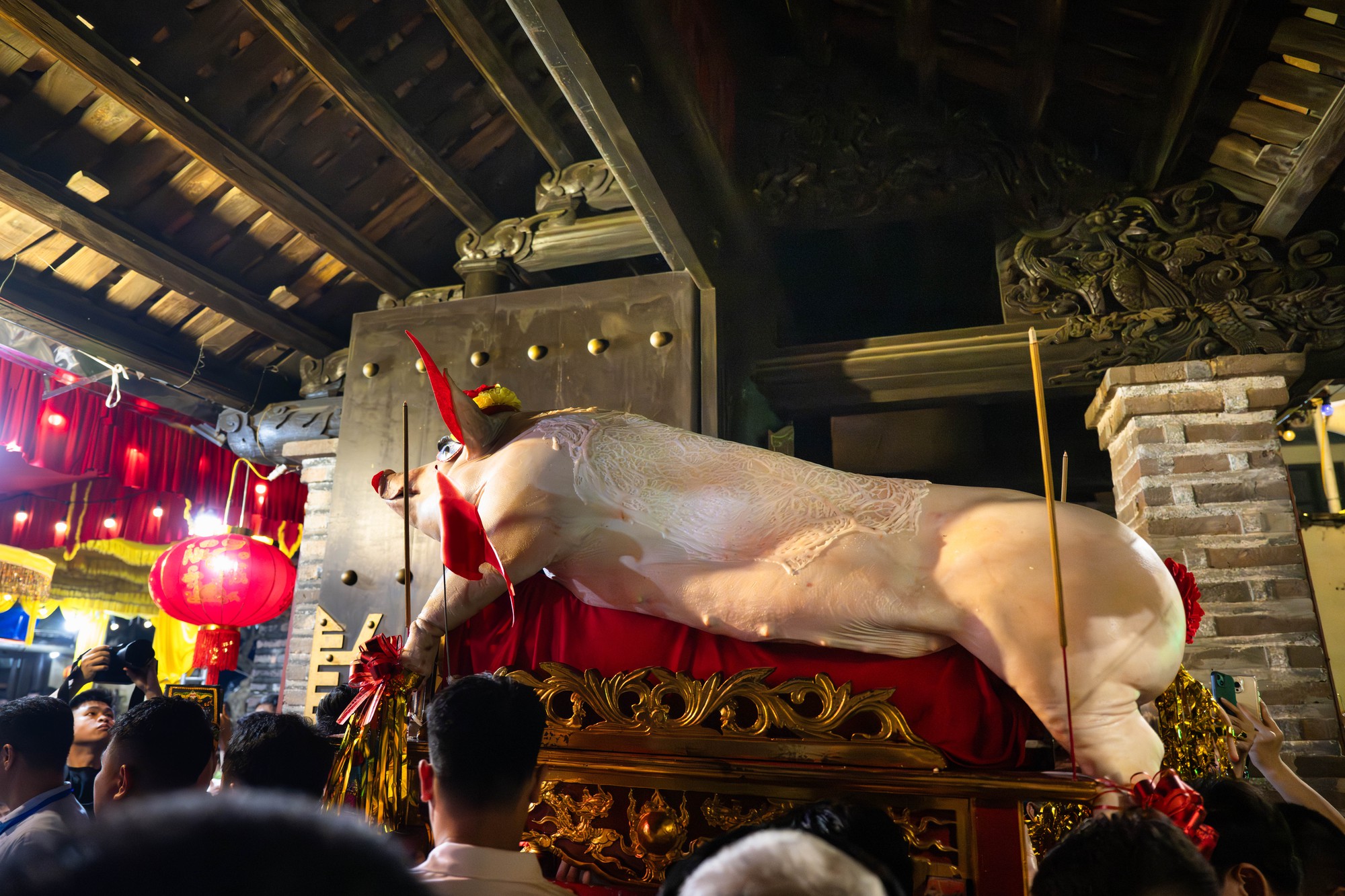 Khoảng 21h, toàn bộ 17 “ông lợn” của 10 xóm lần lượt được rước vào đình làm lễ tế