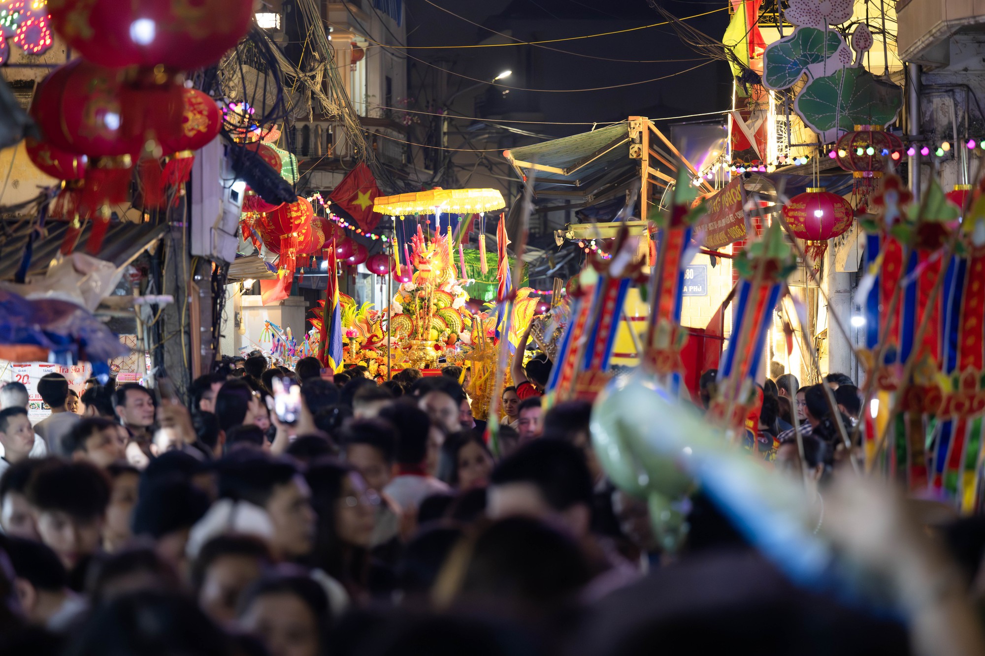 Do trọng lượng lớn, mỗi kiệu cần hàng chục thanh niên phối hợp nhịp nhàng để khiêng. Hai bên đường, người dân đứng chật kín theo dõi và cổ vũ