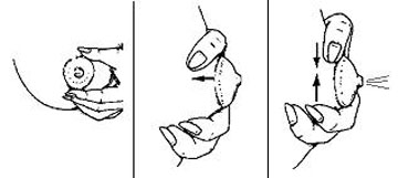 Dùng ngón tay cái, ngón tay trỏ và ngón giữa, tạo thành chữ C bao quanh quầng vú. Các ngón tay nên cách quầng vú 1-2 cm. Với hình dạng chữ C như thế, bạn thử nhẹ nhàng đẩy vú về phía trước. Ép nhẹ ngón tay cái và ngón tay trỏ vào nhau để tạo lực vắt sữa nhưng không được kéo hay giật. Hình dung các ngón tay của bạn đang giúp sữa chảy từ trung tâm ra khỏi đầu ti.