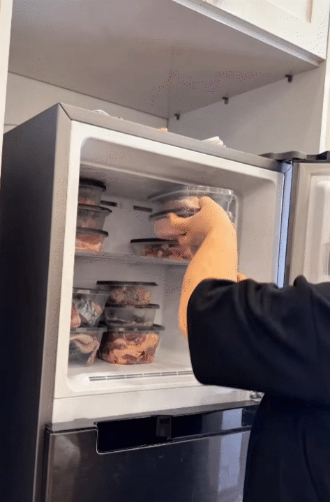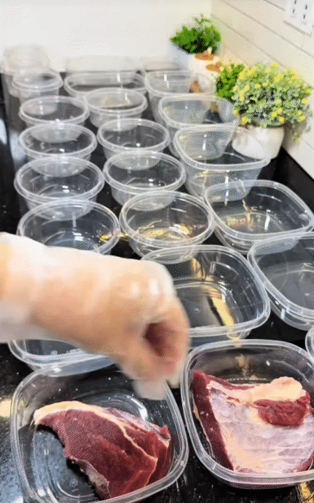 Sau khi đi chợ về, toàn bộ đồ ăn được làm sạch, chia nhỏ theo từng bữa rồi đóng hộp kín. Mỗi bữa ăn tương ứng với một phần thực phẩm, khi cần chỉ việc lấy ra rã đông, không phải xử lý lại từ đầu. "Thức ăn chia nhỏ theo bữa, ăn bữa nào lấy bữa đấy, không cần rã đông cả tảng", chị chia sẻ.
