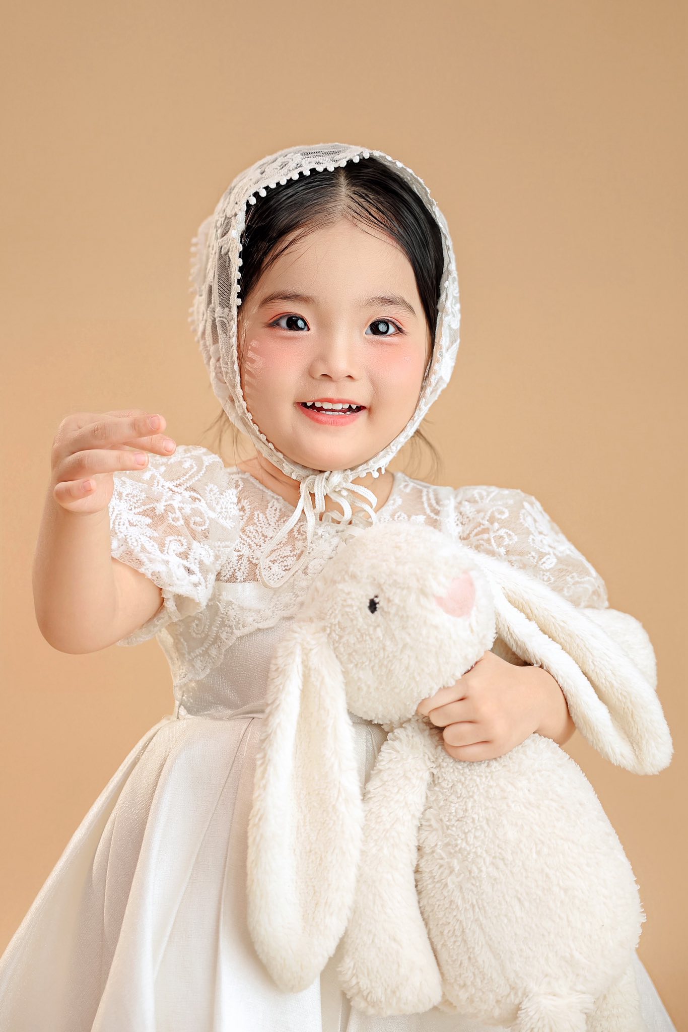 Trong bộ trang phục váy ren trắng tinh khôi cùng chiếc mũ bonnet cổ điển, cô bé biến hóa linh hoạt từ những biểu cảm ngây ngơ, nũng nịu bên chú thỏ bông đến những khoảnh khắc cười thả ga đầy tự nhiên. Chính sự hồn nhiên này đã giúp bộ ảnh thoát khỏi khuôn mẫu sắp đặt khiến người xem lụi tim vì vẻ đáng yêu.