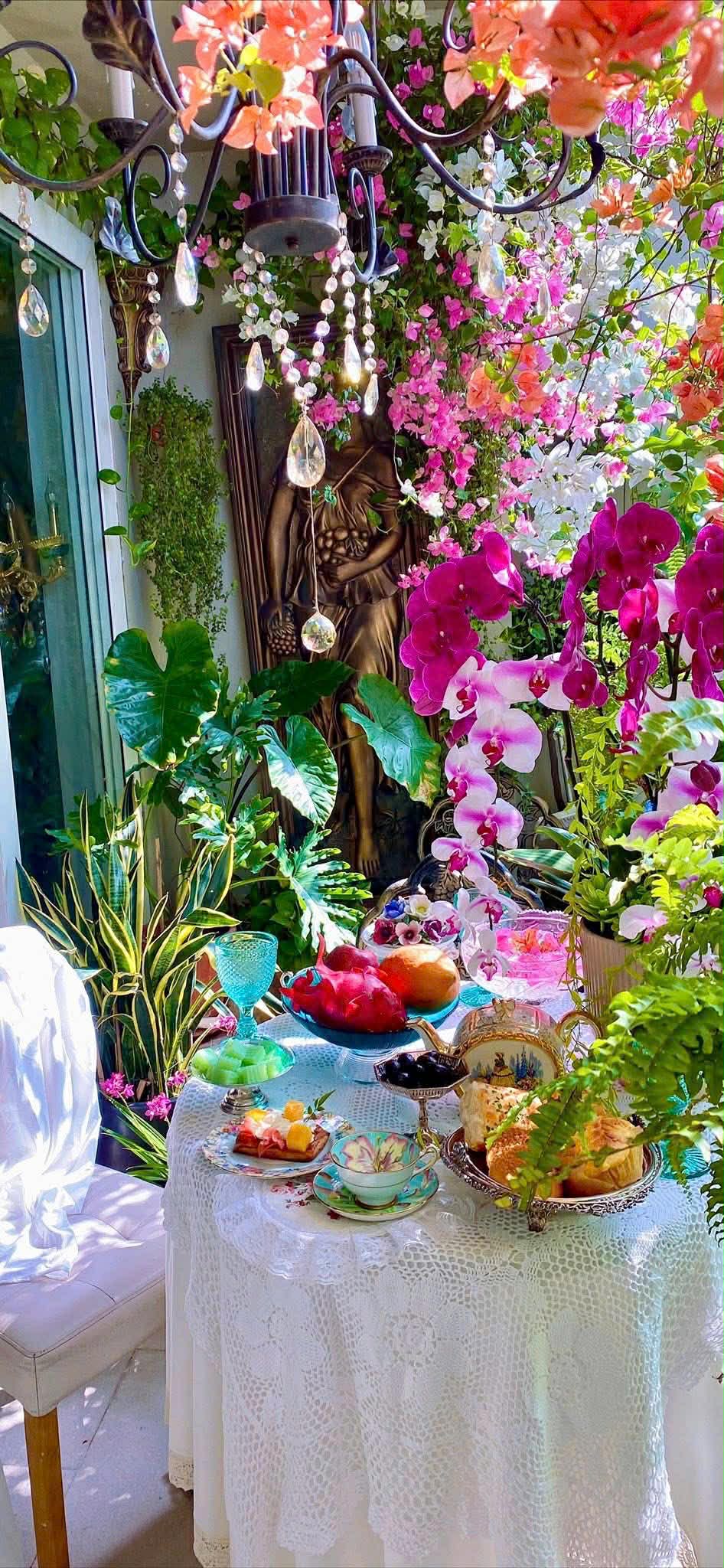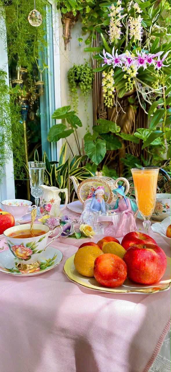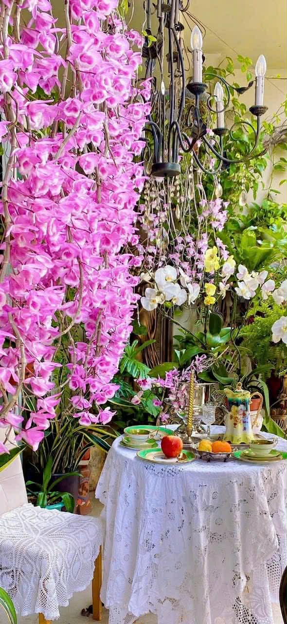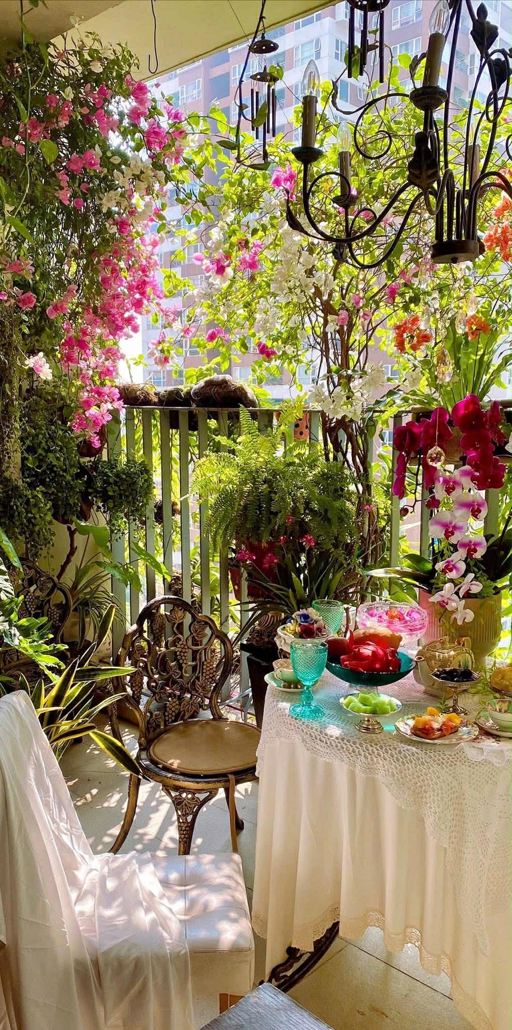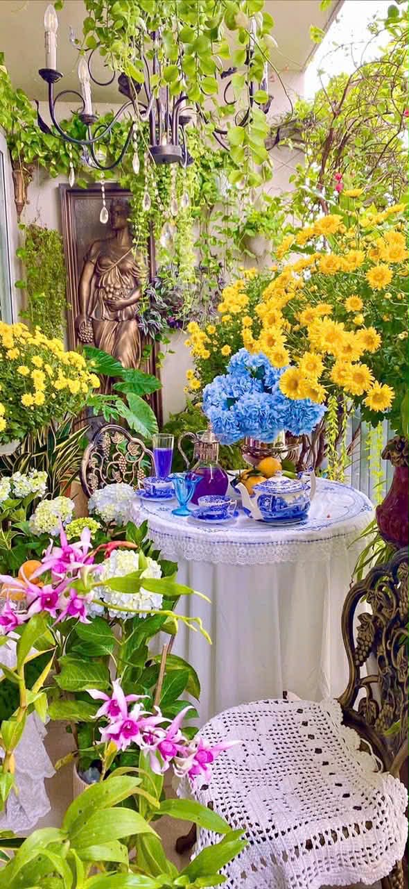 Ở góc ban công ấy, một bàn trà nhỏ luôn hiện diện. Đó là nơi cô Lan ăn sáng mỗi ngày, thưởng trà buổi chiều, hay mời bạn bè đến chơi khi hoa nở đẹp nhất.