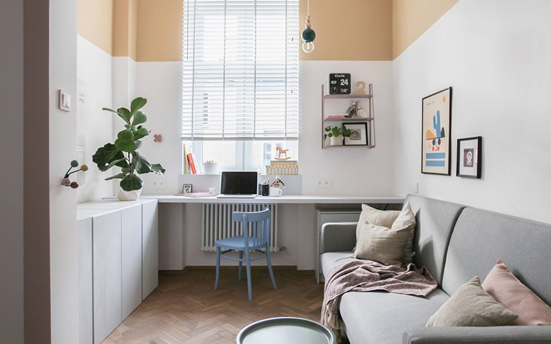 Không gian chính là phòng khách nhỏ với ghế sofa và góc làm việc đặt ngay cửa sổ giúp lấy trọn ánh sáng tự nhiên. Bàn làm việc nổi là một giải pháp hoàn hảo cho không gian nhỏ. Tường được chia khối theo màu tạo nên sự bắt mắt và tươi vui. Các tủ lưu trữ được đặt dọc theo hướng căn hộ và không làm lộn xộn không gian nhờ kiểu dáng đẹp và không quá lớn. Mặt tủ được tận dụng làm góc trang trí với những chậu cây xanh.