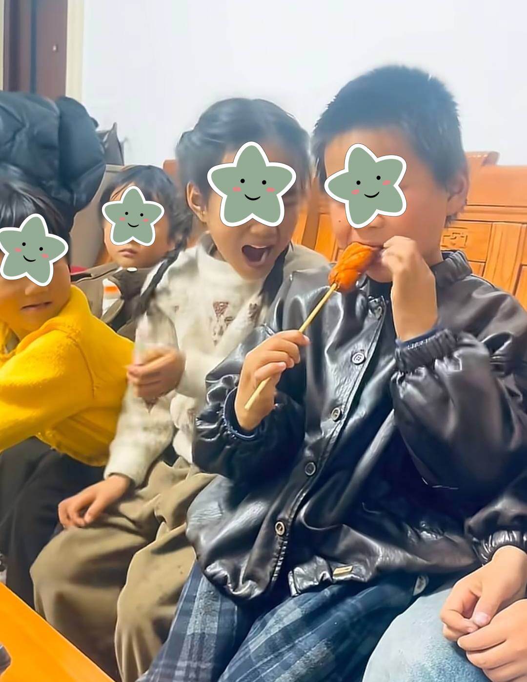 Sau đó là 5 đứa trẻ lần lượt chia nhau 1 cây xúc xích (Ảnh chụp màn hình)
