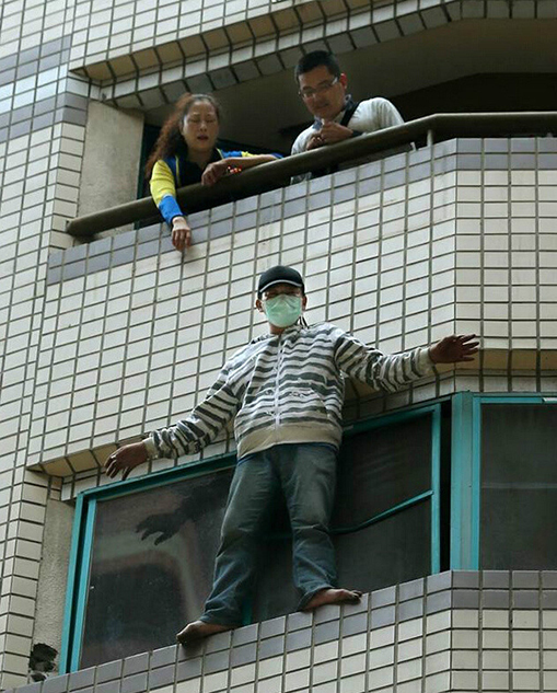Người đàn ông tên Wu, 40 tuổi. Khi cảnh sát đến hiện trường, ông Wu đang trong tình trạng hoảng loạn. Bờ tường khá hẹp, chỉ cần lỡ tay, ông Wu sẽ rơi xuống dưới.