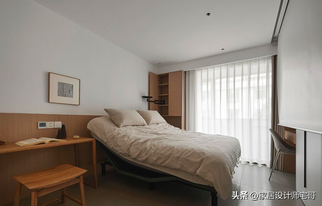 Phòng ngủ sử dụng tủ quần áo cao sát trần để tăng không gian lưu trữ. Việc tích hợp khu trang điểm và làm việc ngay trong phòng ngủ giúp tận dụng từng mét vuông hiệu quả.