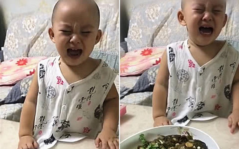 Cậu bé khóc to và nhất định không chịu ăn cá.