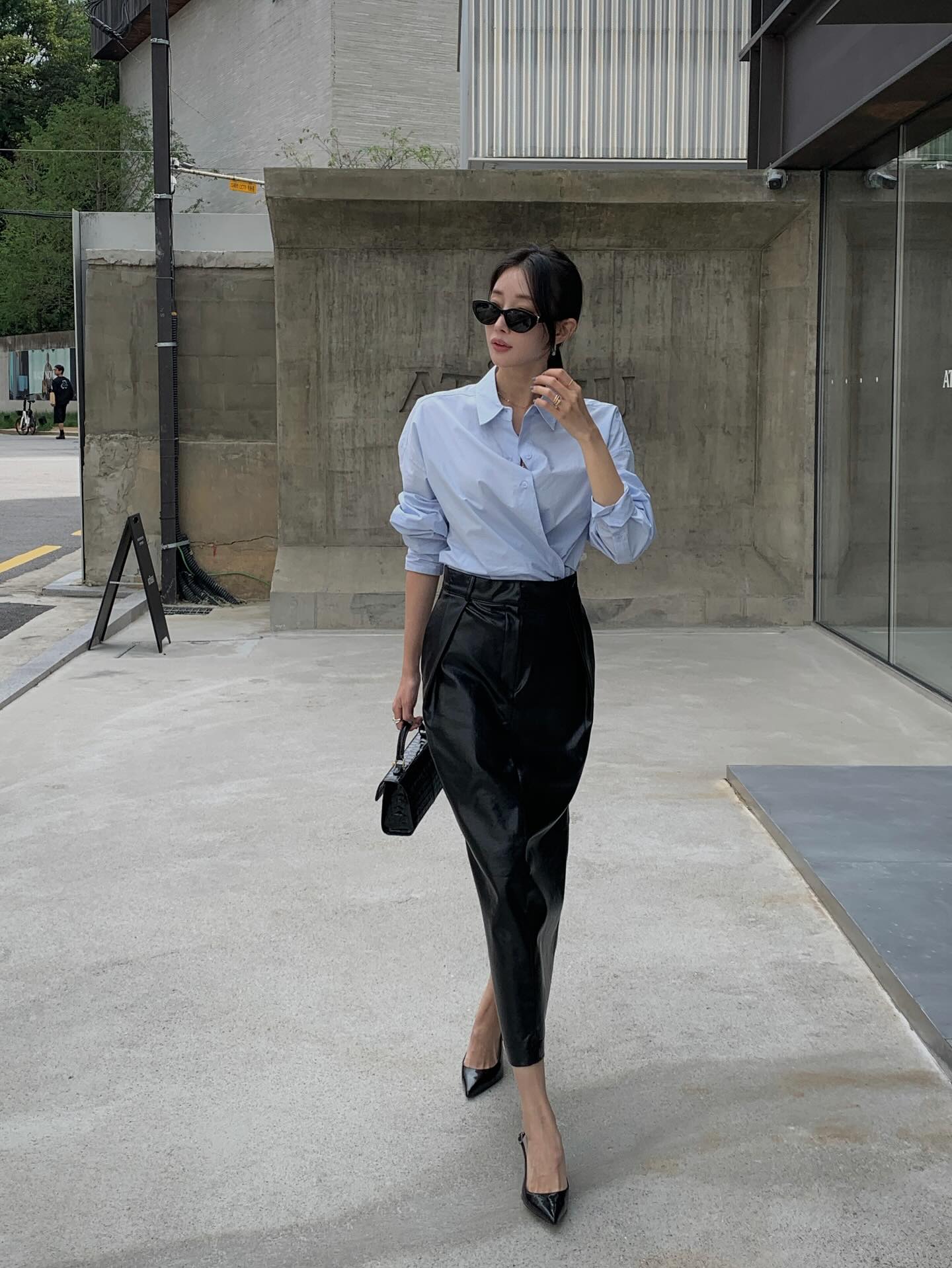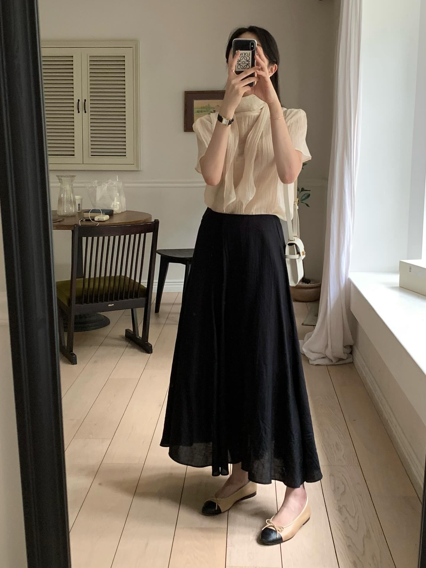 Điểm thú vị của áo blouse là khả năng "nâng tầm" chân váy đen tưởng chừng đơn giản thành một outfit đầy cuốn hút mà không cần quá nhiều phụ kiện cầu kỳ.