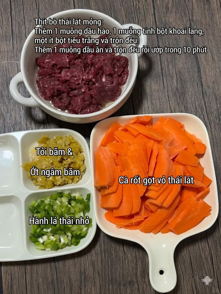 Nguyên liệu làm món cà rốt xào thịt bò: 150g thịt bò, 1 củ cà rốt, 3 tép tỏi băm nhỏ, 1-2 quả ớt ngâm băm, một ít hành lá thái nhỏ, dầu hào, 1 muỗng canh tinh bột khoai lang, bột tiêu trắng, muối.