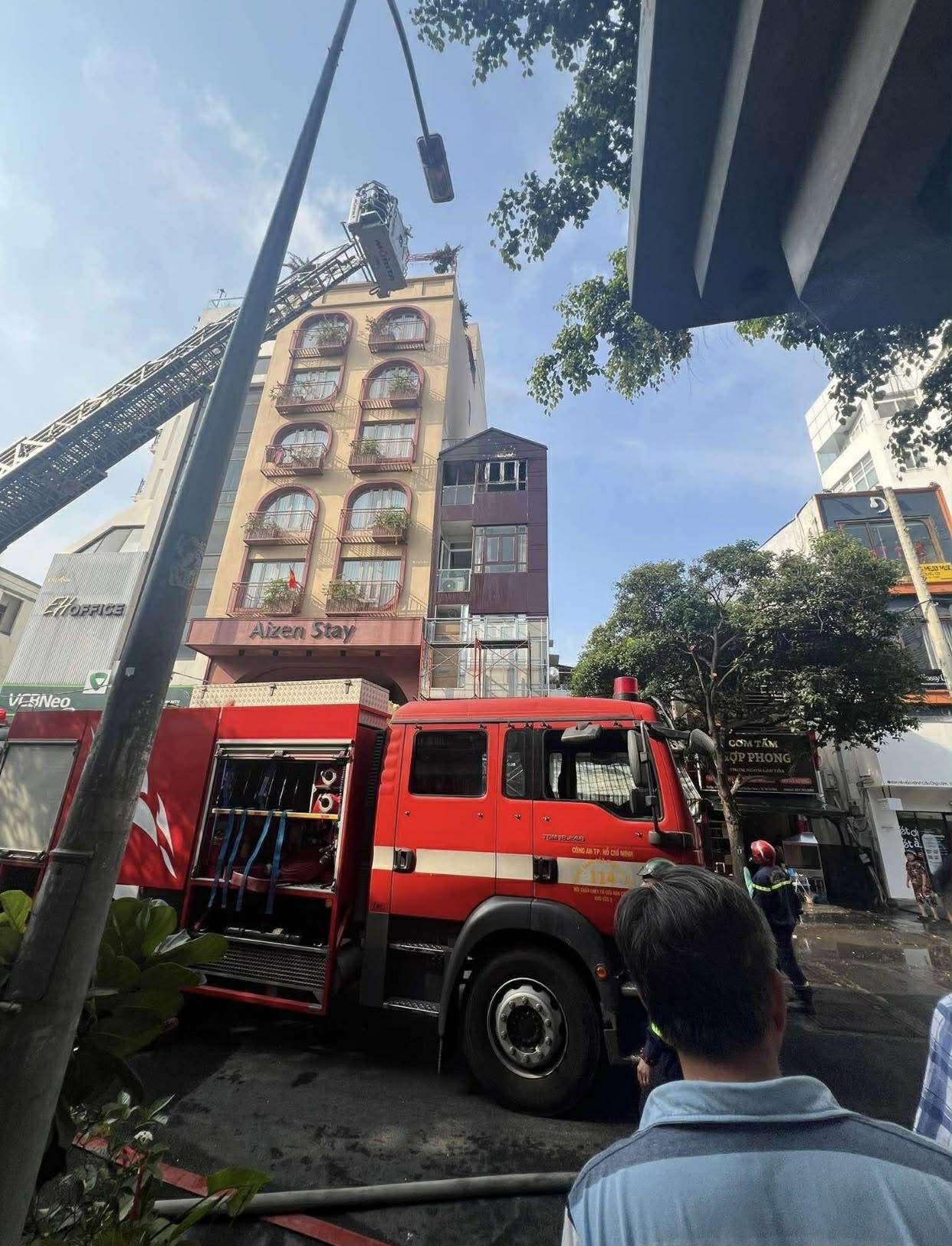 Nhận tin, Công an cùng lực lượng Cảnh sát PCCC Công an TP.HCM đã có mặt phong toả hiện trường để chữa cháy. Xe thang được huy động để chữa cháy từ trên cao.