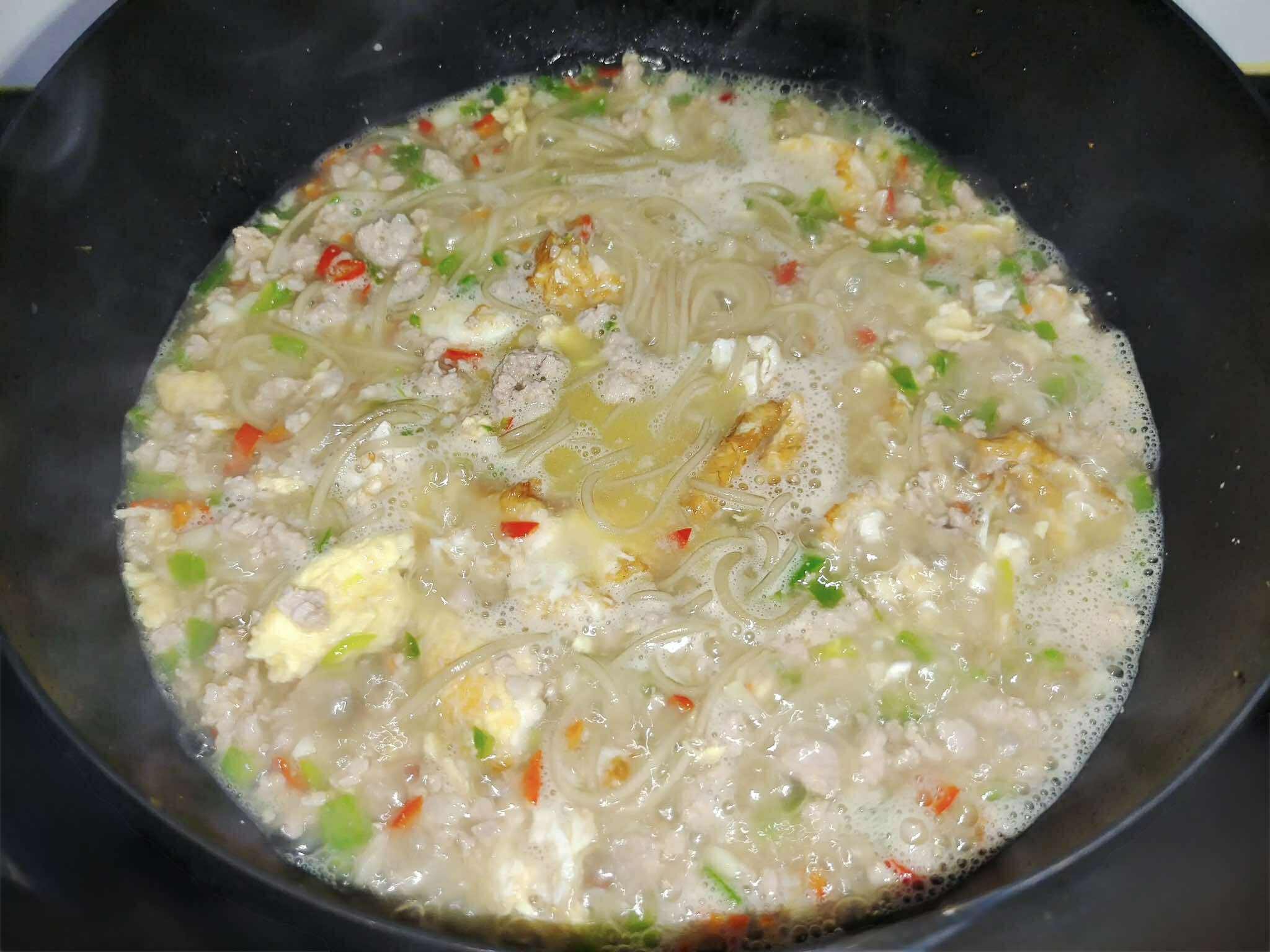 Lưu ý: Bạn cũng có thể chiên trứng trước rồi lấy ra để riêng. Sau đó xào thịt băm rồi cho ớt, tỏi băm ngọt băm vào đảo cùng. Kế tiếp cho gia vị, đảo đều rồi thêm nước sôi cùng trứng vào. Sau đó nêm nếm gia vị rồi thêm bún, nấu chín.