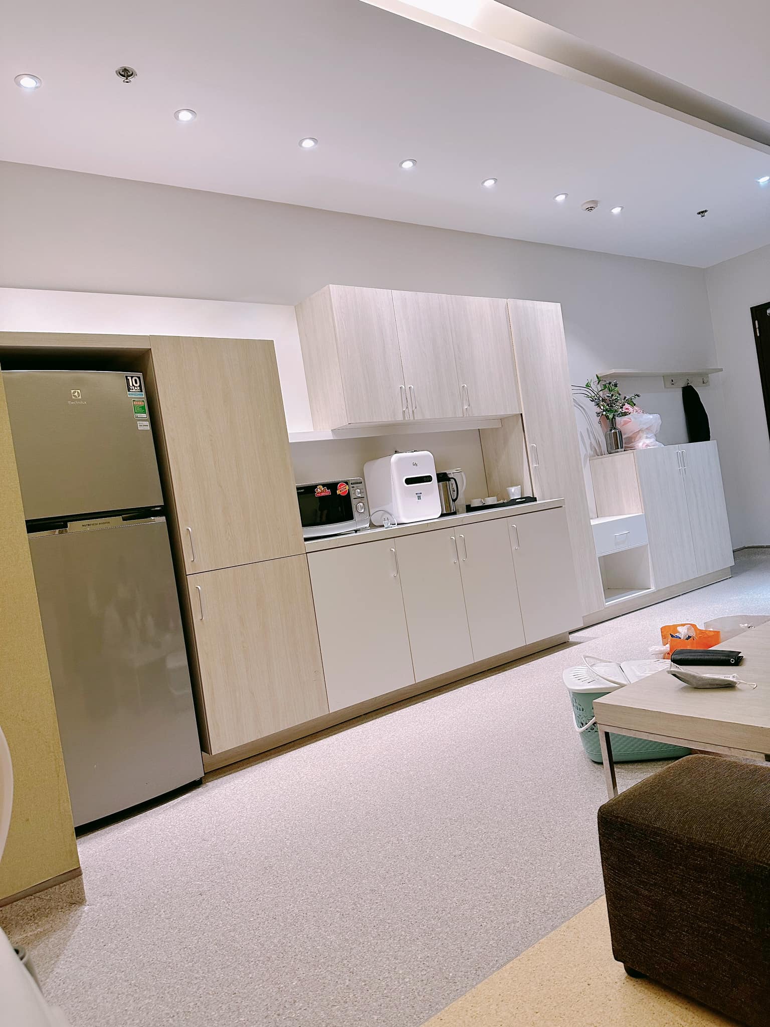 "Mình chọn phòng VIP vì bản thân thích sự yên tĩnh, thoải mái. Phí phòng VIP là 3 triệu đồng/ngày đã bao gồm ngày 4 bữa ăn cho thai phụ. Chọn phòng VIP thì chỉ có thai phụ và người nhà thai phụ thôi. Trong phòng này đầy đủ tiện nghi như ở nhà mình. Từ tủ lạnh, TV, lò vi sóng, két sắt… đến các dụng cụ hỗ trợ sau sinh như máy vắt sữa, máy tiệt trùng, máy hâm khăn giấy, ấm đun nước, ấm đun nước pha sữa… đều đầy đủ. Thậm chí có cả gương soi xịn sò như khách sạn.
