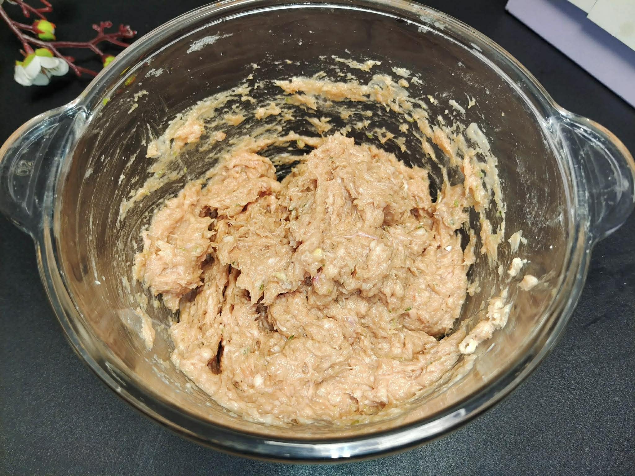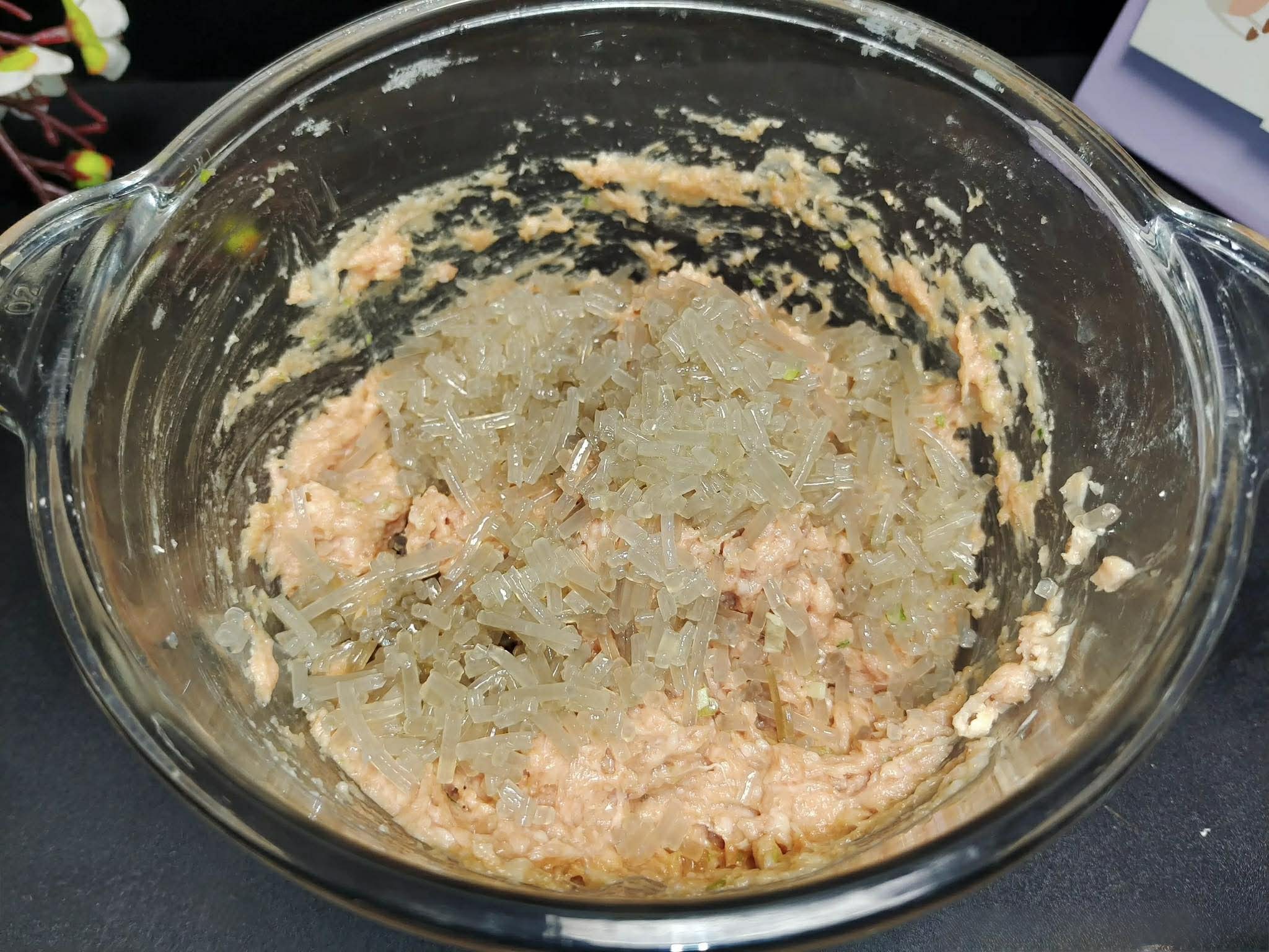 Bước 2: Cho thịt cho vào máy xay thực phẩm, thêm một chút muối, nước tương, dầu hào, hành lá và gừng vào. Sau đó bật máy và xay thành hỗn hợp thịt băm. Tiếp theo, thêm vào một ít nước (hoặc nước hành lá và gừng) vào, rồi bật máy xay lại cho đến khi nước được hấp thụ hết. Cuối cùng, thêm một ít tinh bột khoai lang và trộn đều. Sau đó cắt miến thành các đoạn nhỏ, cho vào trộn đều cùng hỗn hợp thịt.