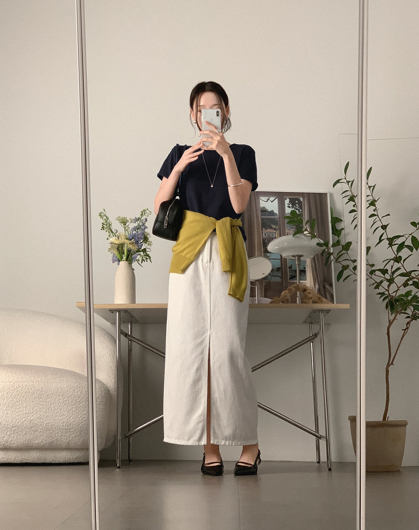 Cách phối này đặc biệt phù hợp với môi trường làm việc chuyên nghiệp hoặc những dịp cần sự chỉn chu. Nó giúp bạn trông trưởng thành hơn mà vẫn giữ được nét mềm mại của chân váy sáng màu.
