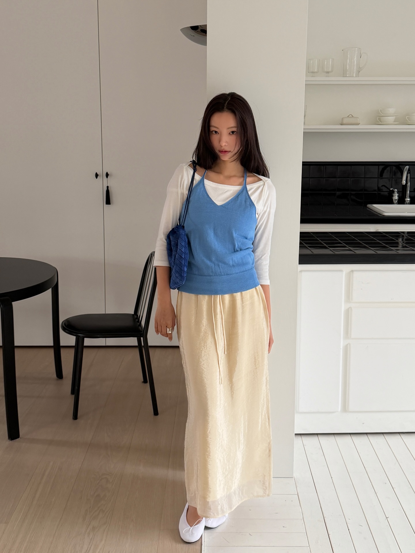 Nhiều người thường nghĩ chân váy sáng màu chỉ hợp với những gam màu tương tự, nhưng thực tế, khi kết hợp với áo màu trầm, bạn sẽ có một tổng thể cực kỳ cân bằng và hiện đại. Các màu như đen, nâu, xanh navy hay xám đậm sẽ giúp "hạ nhiệt" độ sáng của chân váy, tạo nên sự hài hòa và chiều sâu cho trang phục.