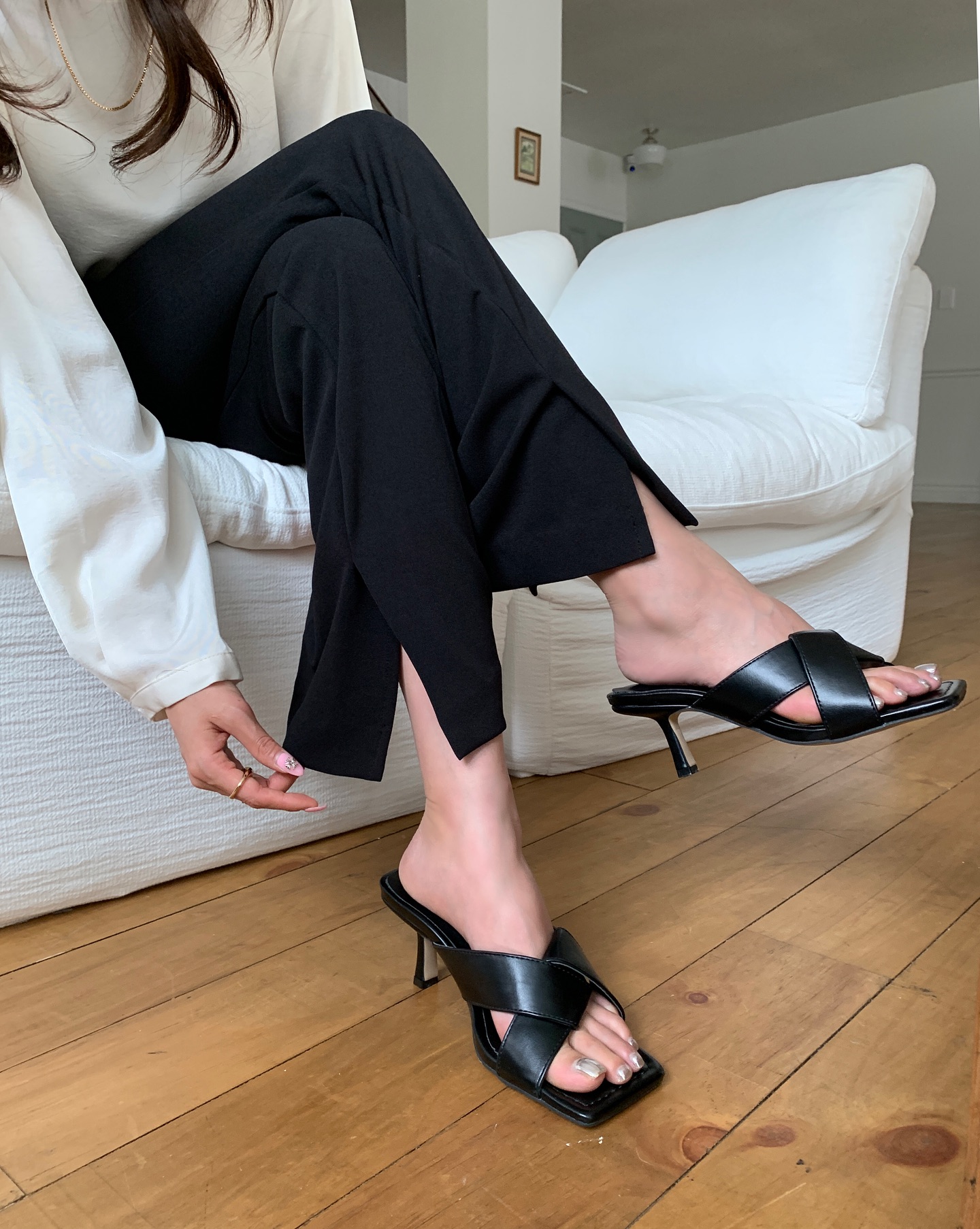 Sandal mule đặc biệt phù hợp với môi trường công sở sáng tạo hoặc những buổi gặp gỡ cần sự lịch sự vừa phải. Bạn có thể phối cùng quần âu lửng, áo sơ mi mỏng hoặc váy liền thân dáng suông. Sự kết hợp này mang lại hình ảnh hiện đại, tự tin mà không quá cầu kỳ.