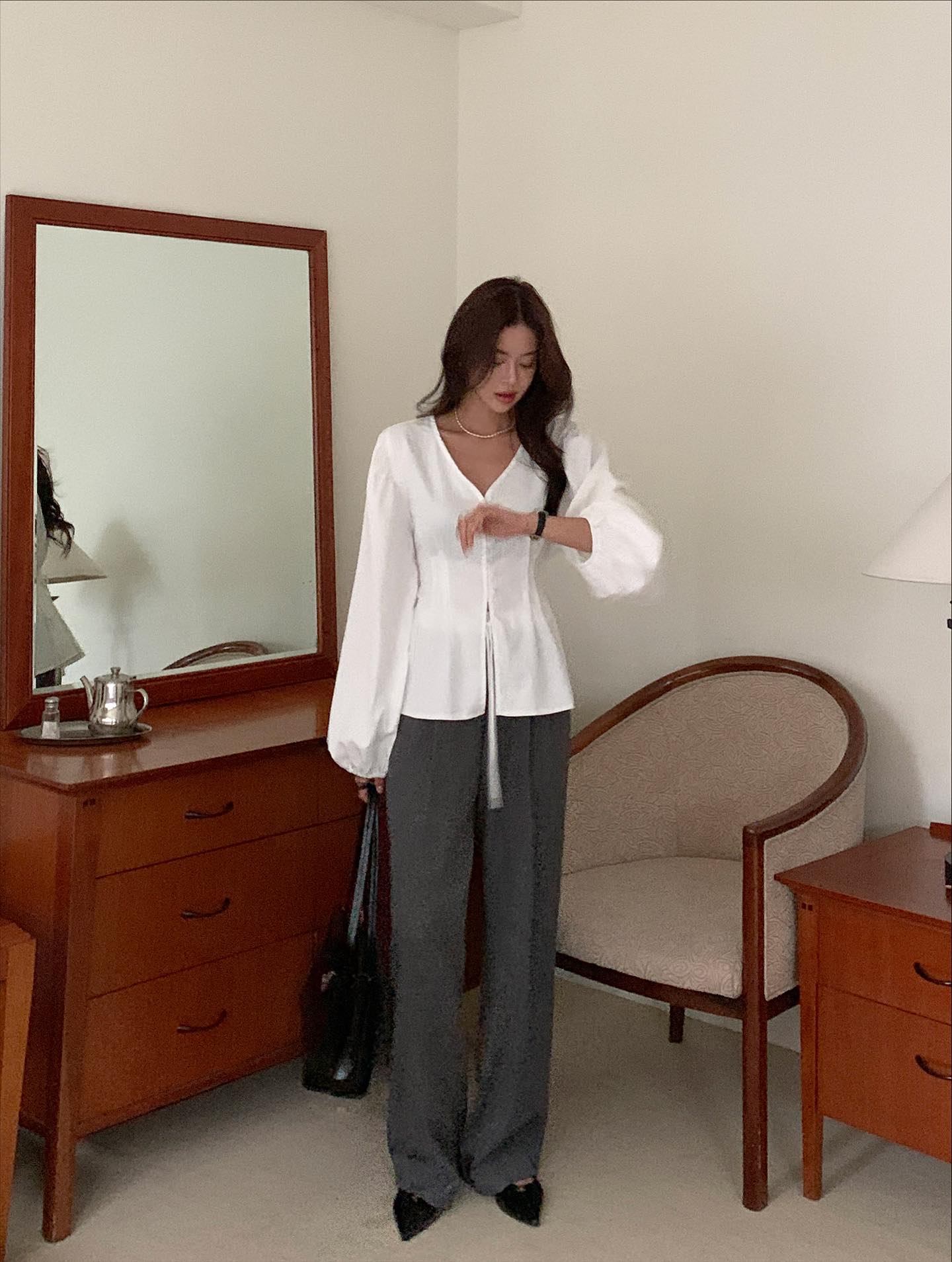 Item này đặc biệt phù hợp khi bạn cần một outfit lịch sự để đi chúc Tết họ hàng. Kết hợp quần âu ống suông với áo len cộc tay hoặc cardigan dáng ngắn, thêm một đôi giày mũi nhọn hoặc sandal là đã đủ thanh lịch. Chỉ cần chú ý chọn màu sắc hài hòa là tổng thể đã rất "Tết" mà không cần quá cầu kỳ.