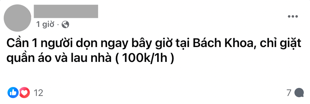 “Cần 1 người dọn homestay bây giờ, 120k/ tiếng”, “Em cần người dọn nhà ngay bây giờ ở Hoài Đức Hà Nội ạ”, “Em cần một bác làm gọn gàng sạch sẽ qua nhà giúp em ạ. Em cần luôn ạ”, “Cần 1 người dọn ngay bây giờ tại Bách Khoa, chỉ giặt quần áo và lau nhà (100k/ giờ),... là những bài đăng cực kỳ phổ biến.