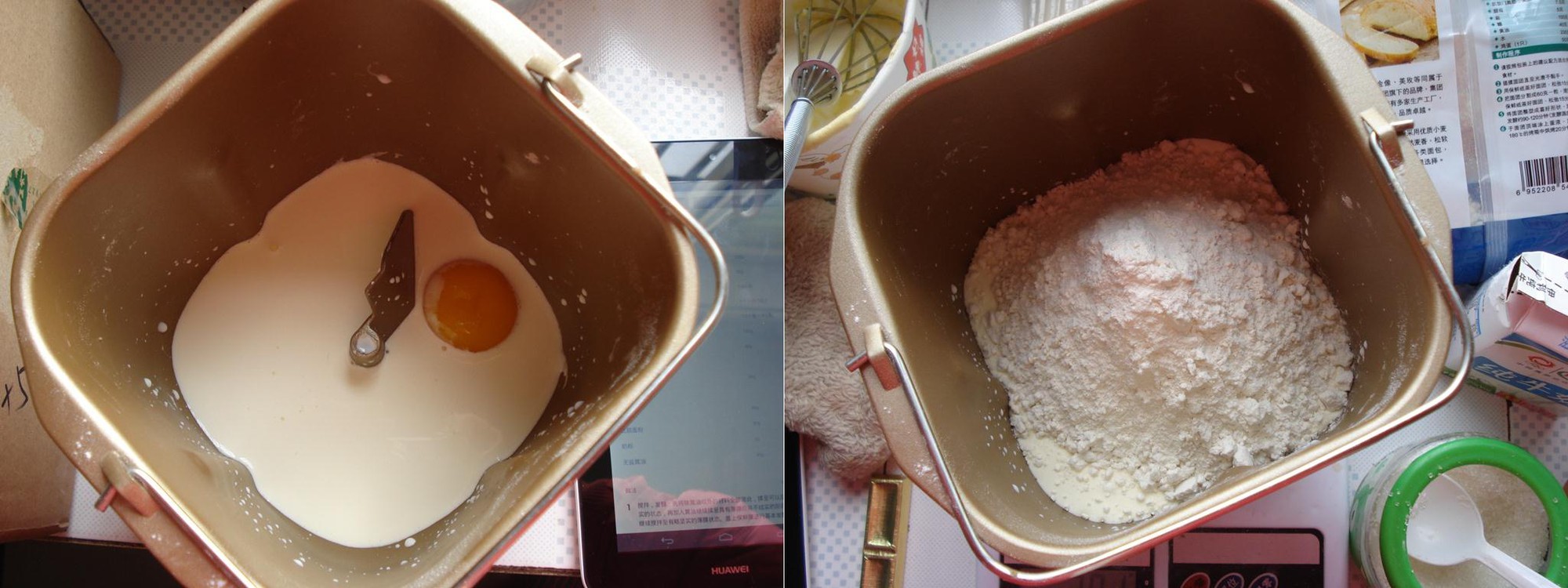 Đổ kem tươi, sữa, lòng đỏ trứng vào tô trộn. Thêm bột mì, muối, đường và men nở vào.