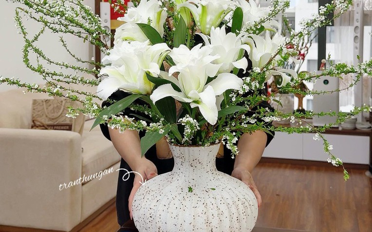 Một điểm cộng khác khiến bình hoa lồng đèn "lên ngôi" là tính linh hoạt khi sử dụng. Dáng bình này phù hợp với nhiều kiểu cắm hoa Tết khác nhau, từ hoa ly, tulip, cúc cho đến những cành hoa nụ kết hợp lá xanh. Đặc biệt, nếu bạn để ý, khi hội chơi hoa đang tích cực lăng-xê mix hoa ly kép và tuyết mai để trưng Tết Bính Ngọ 2026 thì đây là chiếc bình được "chọn mặt gửi vàng" để tôn trọn vẻ đẹp của combo này.