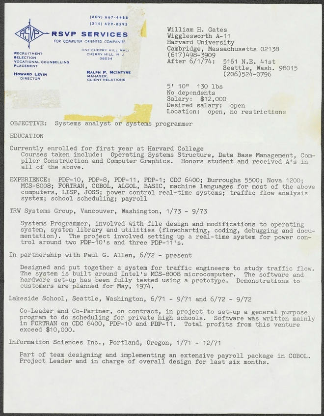 Chiếc CV 50 năm trước của Bill Gates.