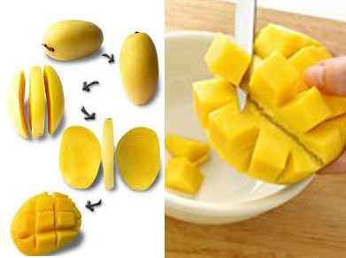 Cách cắt xoài cho bé dễ ăn nhất mẹ có thể thực hiện như sau: Cắt lấy phần má xoài theo chiều dọc, rồi dùng đầu dao nhọn khía thành các khối lập phương nho nhỏ theo ý thích, tránh cắt phải vỏ xoài. Sau đó tách miếng xoài ra sẽ được các miếng xoài nhỏ có thể cho bé cầm ăn luôn hoặc mẹ cắt hẳn ra cho bé.