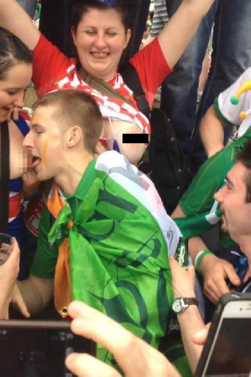 Trước vẻ mặt ỉu xìu của một cổ động viên đội Ireland, một phụ nữ trẻ Croatia đã nghĩ ra cách vạch áo cho anh chàng "nếm" vòng một để "đền bù".