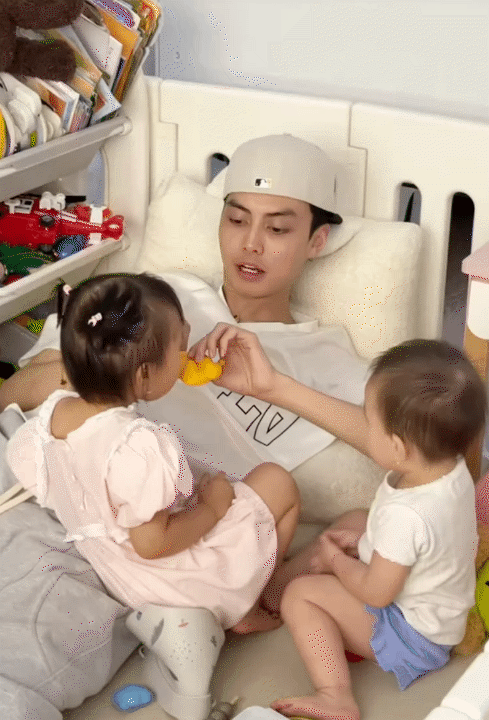 Thậm chí em còn bày đồ chơi đủ các thứ cho các con chơi để rảnh cái tay, vậy mà 2 con 'yêu tinh nhền nhện' này cứ chán một cái là lại bấu vào người em. Khoảnh khắc hạnh phúc nhất trong ngày là lúc 7 rưỡi tối khi 2 đứa nó buồn ngủ, là vợ chồng em mới có thời gian cho bản thân" - bố bỉm Tuấn Dương hài hước tâm sự.