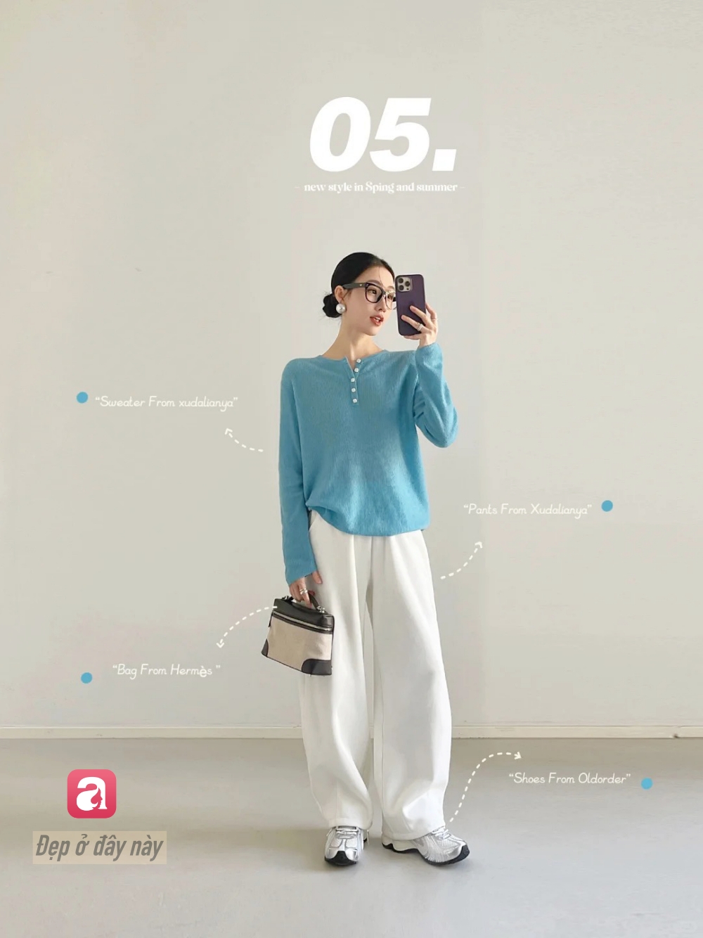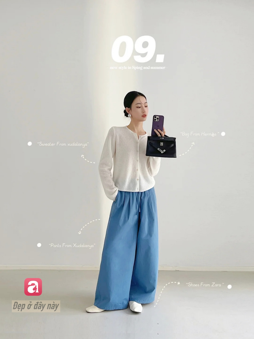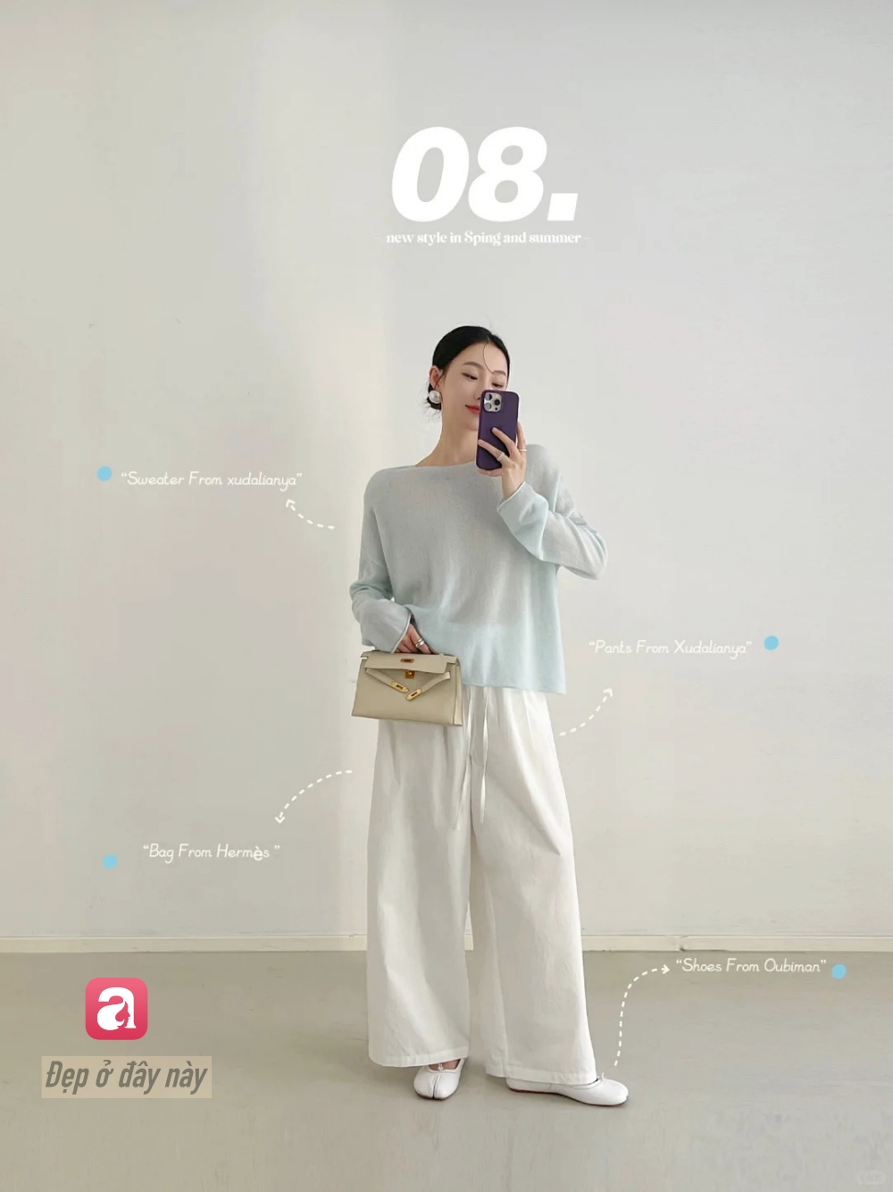 Set đồ này tập trung vào chất liệu và form dáng: áo len mỏng + quần trắng rộng. Không cần chi tiết cầu kỳ, chỉ cần form đẹp là đủ nâng tầm tổng thể.