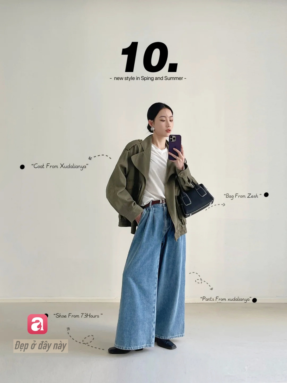 Áo khoác xanh rêu là điểm nhấn chính, giúp outfit basic trở nên cá tính hơn. Mix cùng jeans ống rộng tạo vibe vừa bụi bặm nhẹ, vừa rất thời trang.