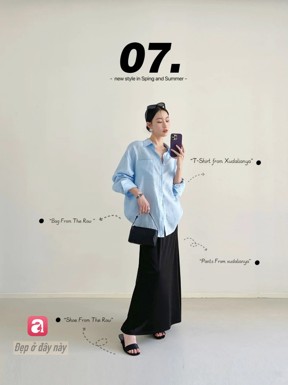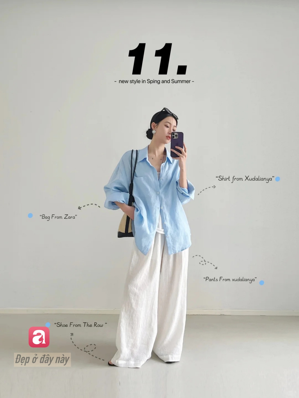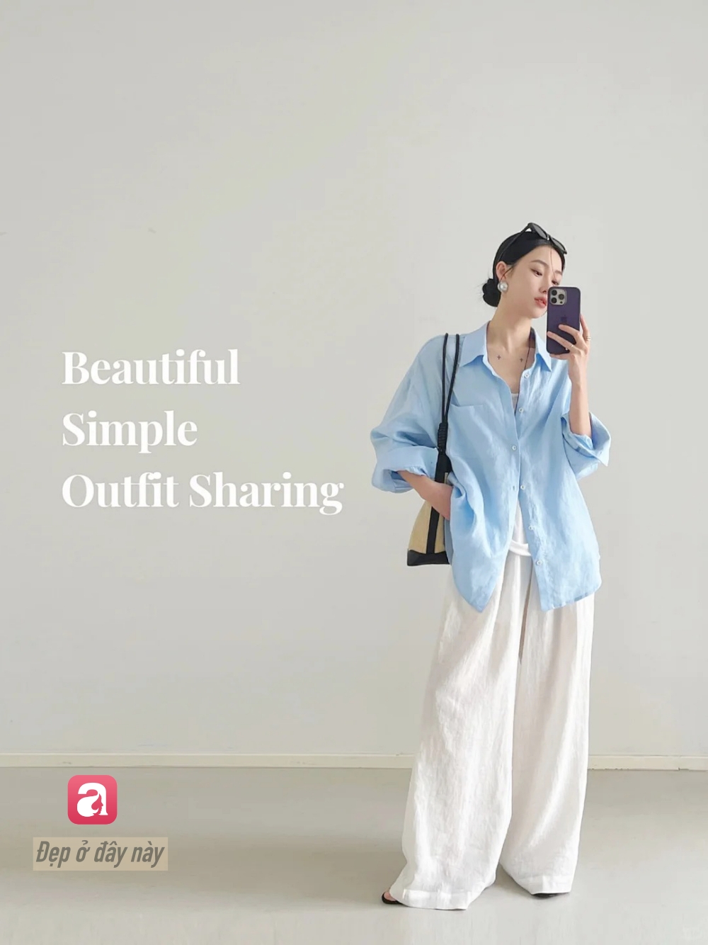 Sơ mi xanh + quần trắng là công thức kinh điển của phong cách tối giản. Điểm quan trọng nằm ở form oversized và cách phối phụ kiện tối giản để giữ được sự tinh tế.
