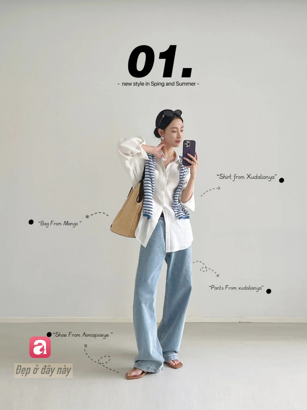 Set đồ này ghi điểm ở cách layer rất “lười nhưng thông minh”: sơ mi trắng oversized làm nền, thêm áo kẻ vắt vai để tạo điểm nhấn. Quần jeans ống rộng giúp tổng thể cân bằng giữa sự thoải mái và gọn gàng.