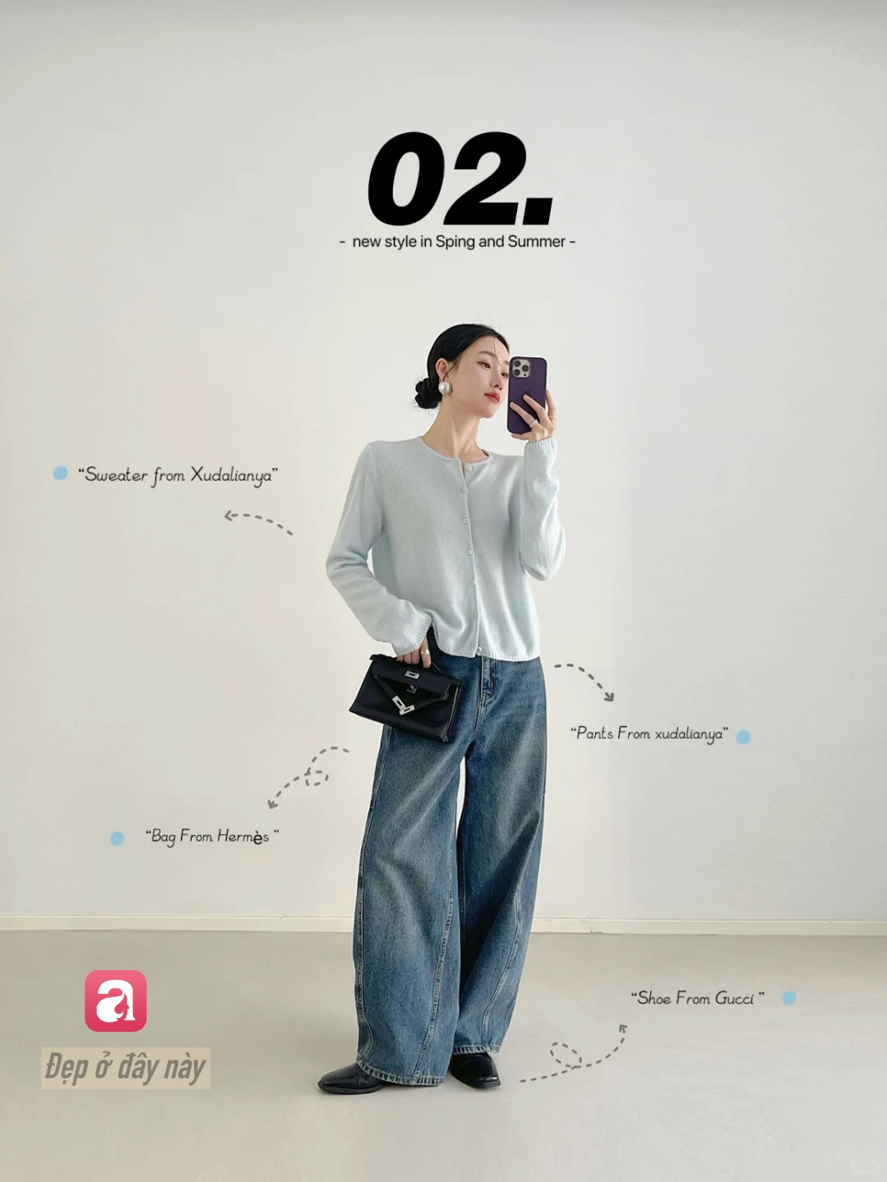 Cardigan xanh nhạt mang lại cảm giác mềm mại, nữ tính hơn hẳn. Khi mix cùng jeans ống rộng và túi đen, outfit được cân bằng giữa nét dịu dàng và sự hiện đại.